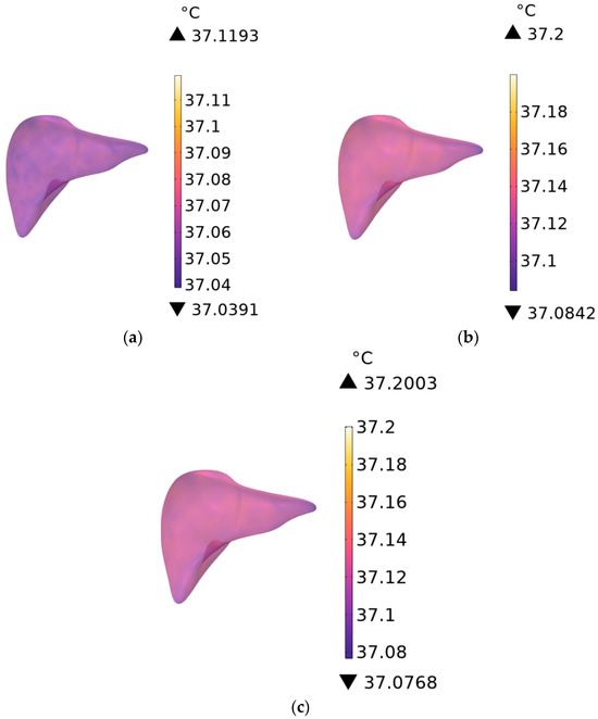 Figure 15a–c show the temperature distribution of the station attendant’s trunk when the RF antennas operate at 900 MHz and the exposure durations of 1 min, 6 min, and 30 min, respectively. Compared with the initial body temperature, the trunk temperature increases by 0.0834 °C, 0.1617 °C, and 0.1795 °C, respectively, with longer exposure durations yielding higher temperature rises. The minimum trunk temperatures at 1 min, 6 min, and 30 min are 36.8778 °C, 36.8027 °C, and 36.7826 °C, respectively; these values are slightly below the initial 37 °C, due to convective heat transfer at the interface between the skin and the environment, most prominently near the fingertips.