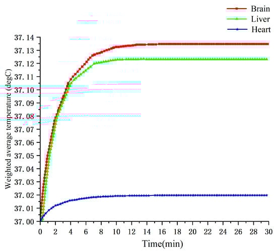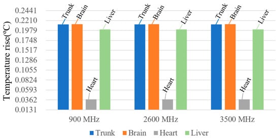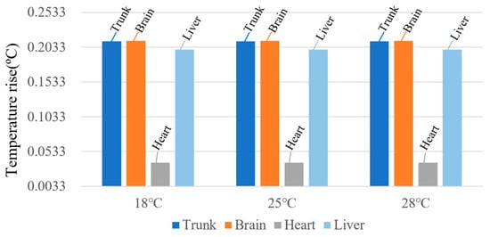 When the RF antenna operates at 900 MHz, the temperature rise in various human tissues is calculated under ambient temperatures of 18 °C, 25 °C, and 28 °C, as shown in Figure 21. The results indicate that the steady-state temperature rise in human tissues is essentially the same at different ambient temperatures. This behavior arises from the body’s robust thermoregulatory capacity when the ambient temperature is well below the core temperature of 37 °C. Under RF exposure, heat dissipation through blood perfusion effectively mitigates the influence of elevated ambient temperature, resulting in only minor variations in tissue heating. These findings suggest that the thermal response remains relatively stable within typical environmental temperature ranges.
