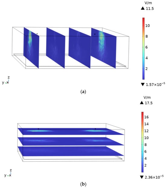 To assess the impact of the built environment on human body temperature rise, the spatial electric-field distribution and corresponding tissue heating are compared between scenarios with and without a subway station environment. At an ambient temperature of 25 °C and the antenna operating frequency of 900 MHz, the spatial electric-field distribution in the subway station environment is shown in Figure 22a,b. The maximum field strengths are 5.96 V/m in the XZ plane and 9.0 V/m in the XY plane. In the computational model, the ceiling, concrete columns, and platform screen doors of the subway station are removed, and the resulting spatial electric-field distribution is shown in Figure 23a,b. In the absence of these structural elements, the maximum electric-field strengths reached 11.5 V/m in the XZ plane and 17.5 V/m in the XY plane. This increase arises because the built environment introduces reflection and partial electromagnetic shielding or absorption. Consequently, compared with an open environment without a built environment, the presence of station infrastructure reduces the spatial electric-field intensity within the subway station.