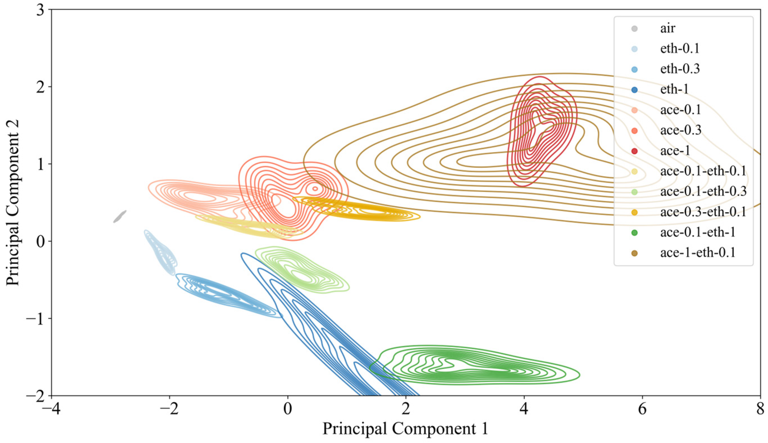 Figure 2. It presents a two-dimensional PCA projection of the gas sensor data, where the horizontal and vertical axes represent Principal Component 1 (PC1) and Principal Component 2 (PC2). PC1 and PC2 explained 84.1% and 13.3% of the total variance of the data, respectively, and the cumulative variance contribution rate reached 97.4%. The scatter plot depicts distinct gas components through color coding: gray for air, blue for ethanol at varying concentrations, red for acetone at different concentrations, and yellow green for ethanol–acetone mixtures. Color intensity corresponds to gas concentration levels, with darker hues indicating higher concentrations.