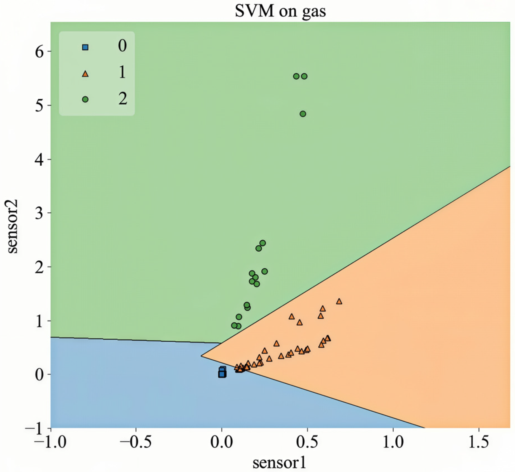 Furthermore, the SVM model demonstrated superior performance across multiple evaluation metrics, including Accuracy, Area Under the Receiver Operating Characteristic Curve (AUROC), Precision, F1-score, and Recall rate, outperforming both baseline models. These results validate the effectiveness and robustness of the proposed approach for gas classification tasks.