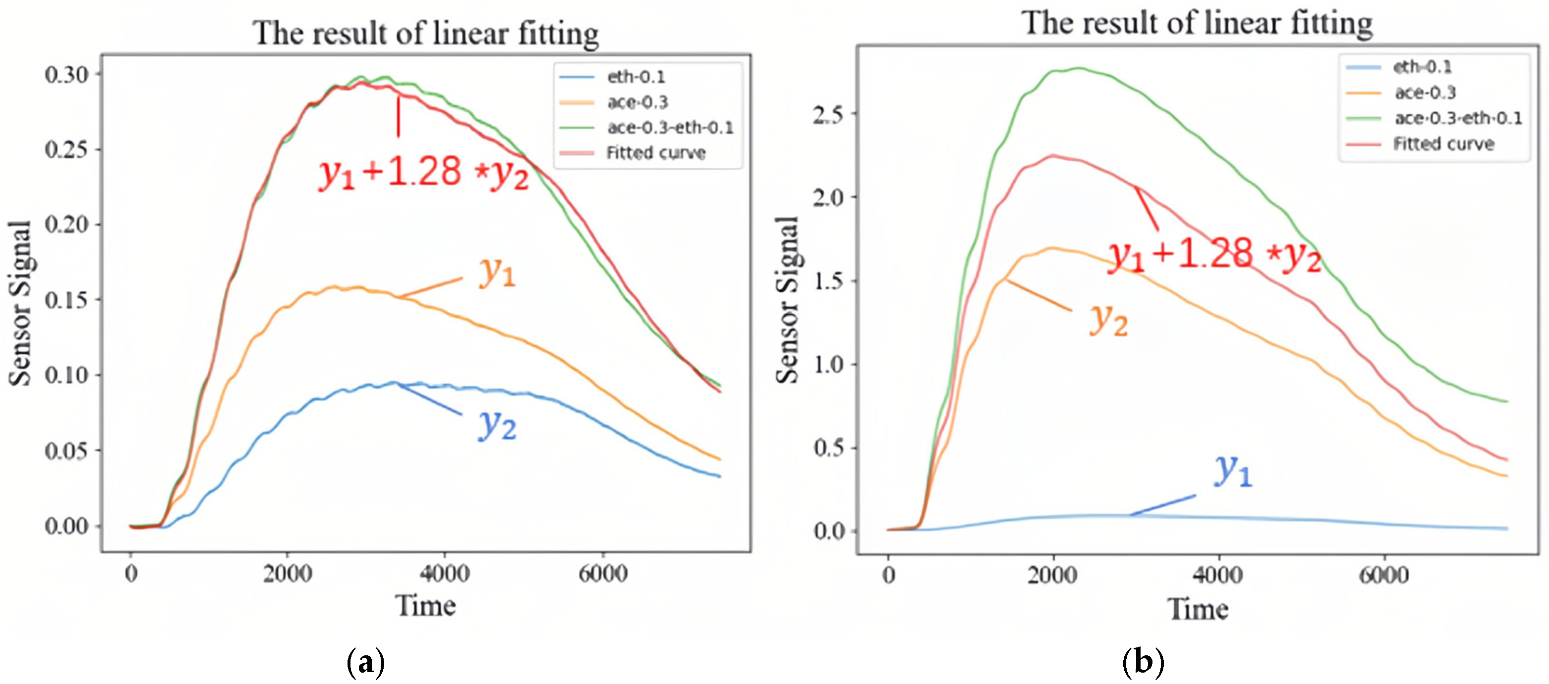 First, it is assumed that there is a linear relationship between the responses of single-gas and mixed-gas, and that the response of mixed-gas is a linear combination with a ratio of 1:1.28 (ethanol/acetone). The fitting result is shown in