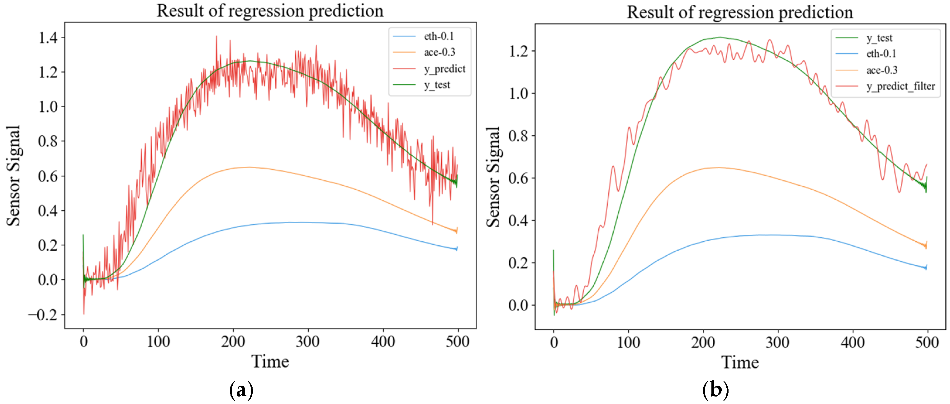 Figure 7a shows a linear fitting of the correlation between single-gas and mixed-gas responses used to train the neural network and generate the regression model. The test results are shown in the figure. According to the test results, the scores were calculated. The correlation between the predicted results and the actual measured results is strong, with a calculated correlation coefficient of 97.83%.