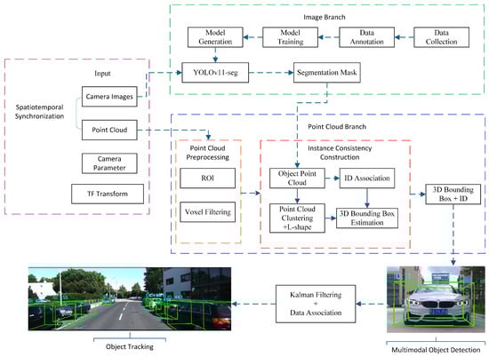 To fully exploit the complementary strengths of visual semantics and LiDAR geometry, this work proposes an instance-aware image–LiDAR fusion framework for 3D object detection and tracking. The overall pipeline consists of two coordinated branches—an image-processing stream and a point-cloud-processing stream—followed by a unified fusion and tracking module, as illustrated in Figure 1.