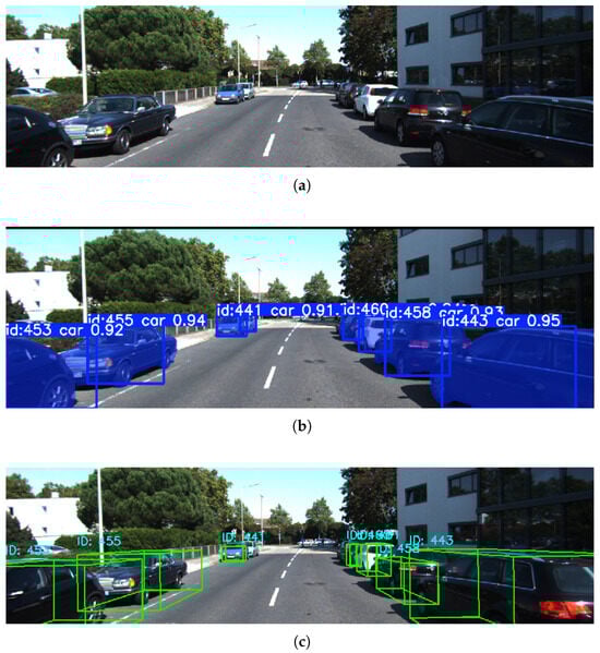 Figure 2 provides a representative visualization of the proposed cross-modal perception framework. Figure 2a shows the raw input image; Figure 2b presents the instance segmentation results; Figure 2c illustrates the 3D bounding boxes generated from clustered LiDAR point clouds, completing the final stage of spatial localization and geometric reconstruction. Together, these results demonstrate that the proposed method achieves accurate semantic–geometric alignment across modalities, providing a reliable 3D perceptual foundation for downstream object tracking and motion-state estimation.