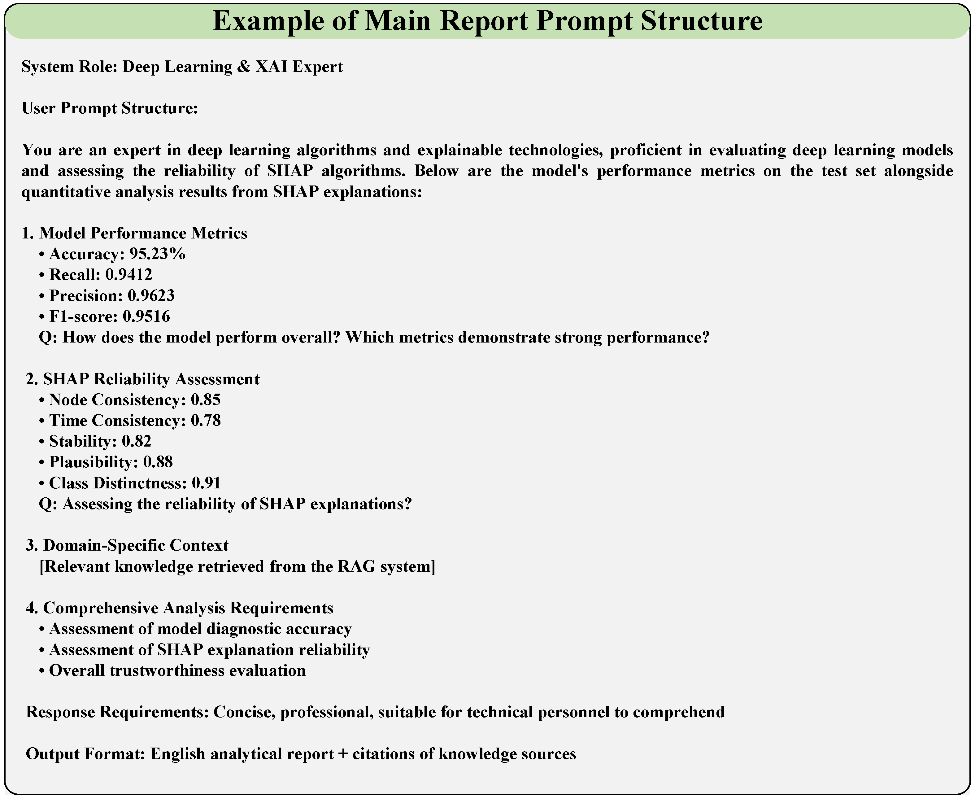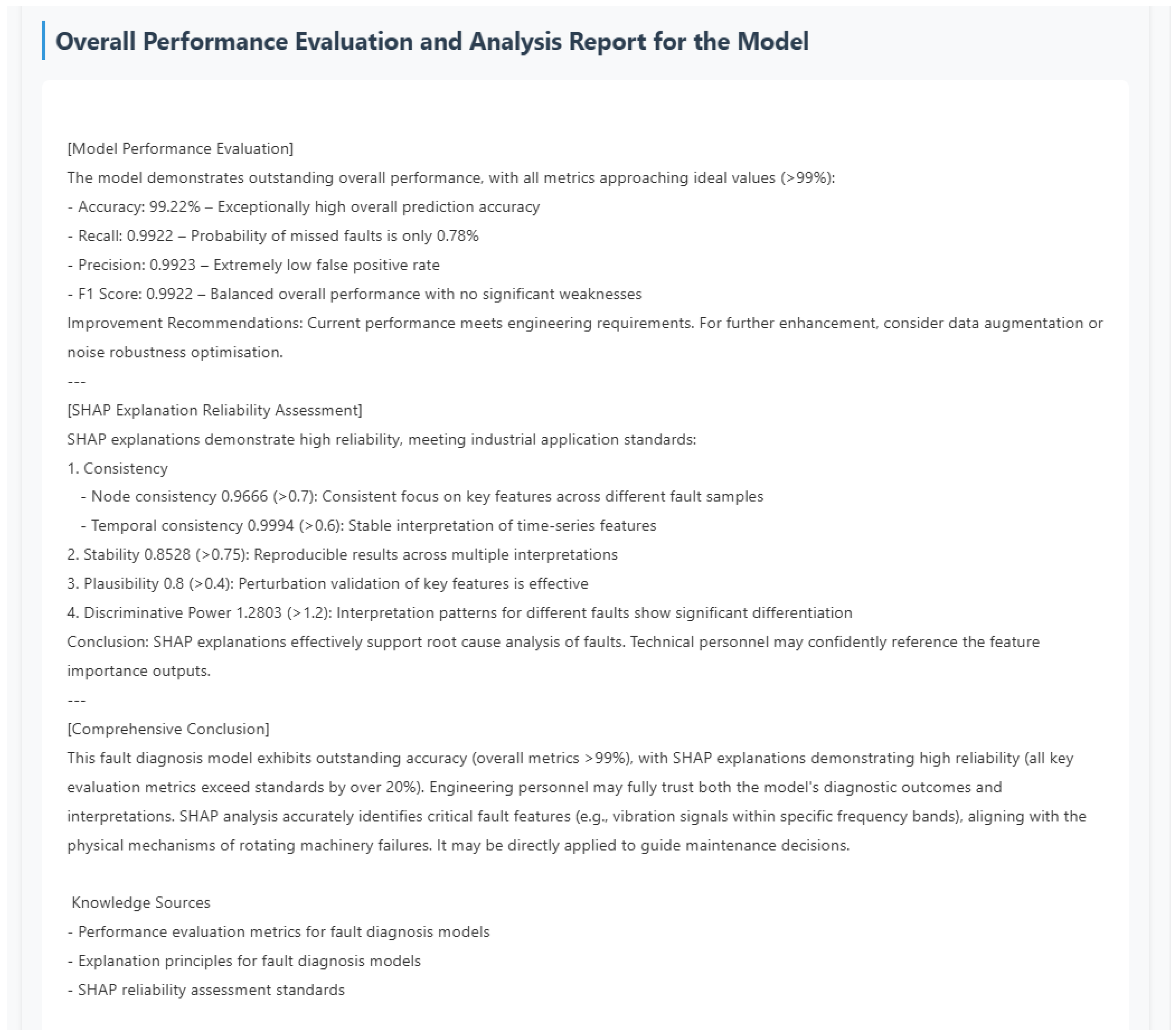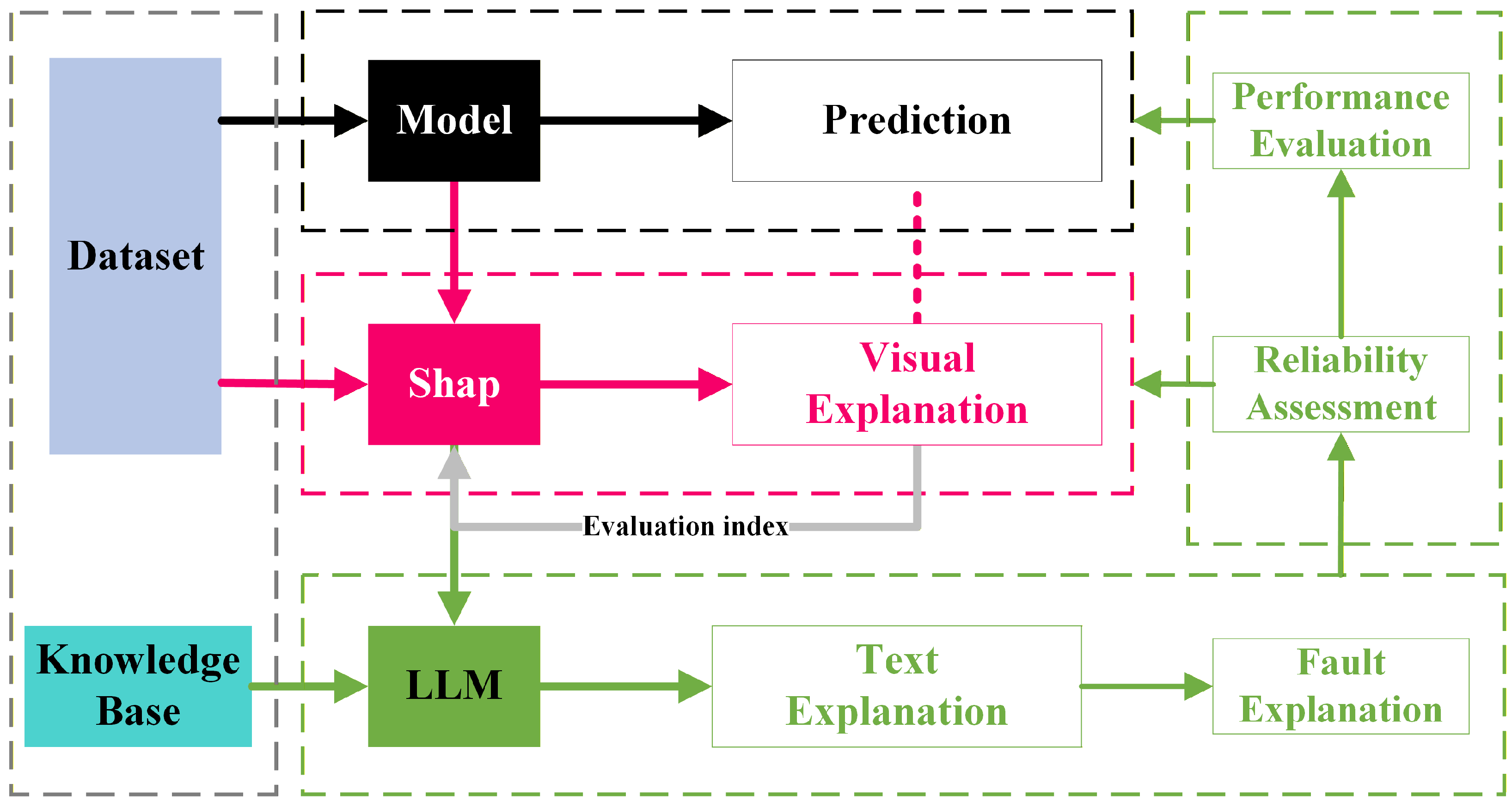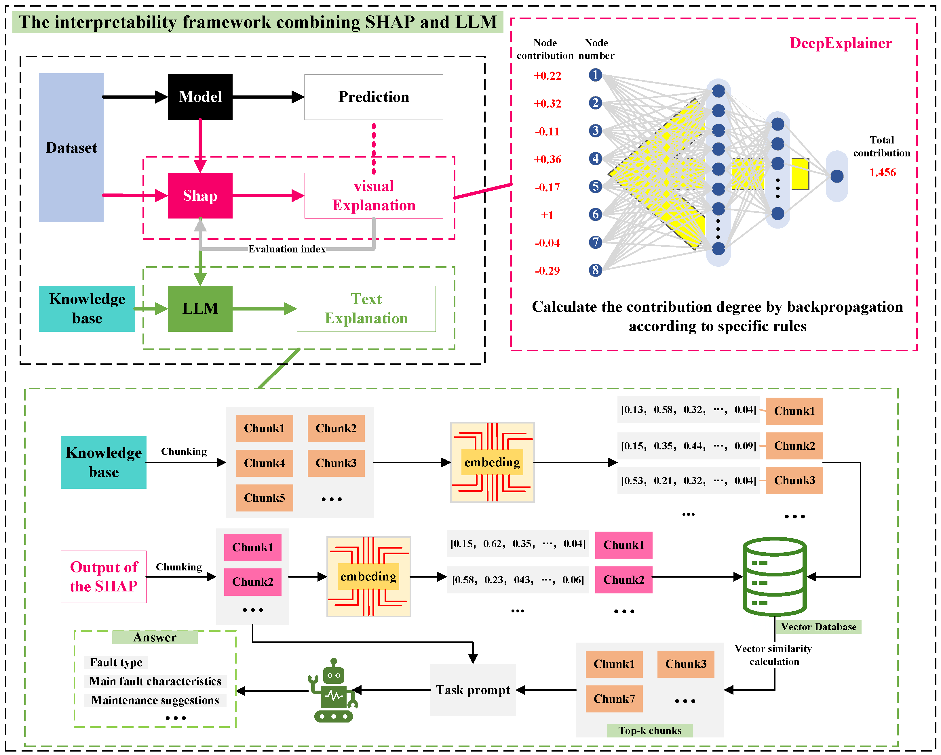 - Combining SHAP quantitative information with expert knowledge and fault diagnosis results, a private knowledge base for fault diagnosis is constructed. Using RAG retrieval enhancement technology and feature prompting engineering, high-dimensional SHAP values are mapped into structured semantic inputs to drive LLMs to generate credible text explanations aligned with domain knowledge, establishing a domain-knowledge-guided text generation mechanism for fault diagnosis explanations.