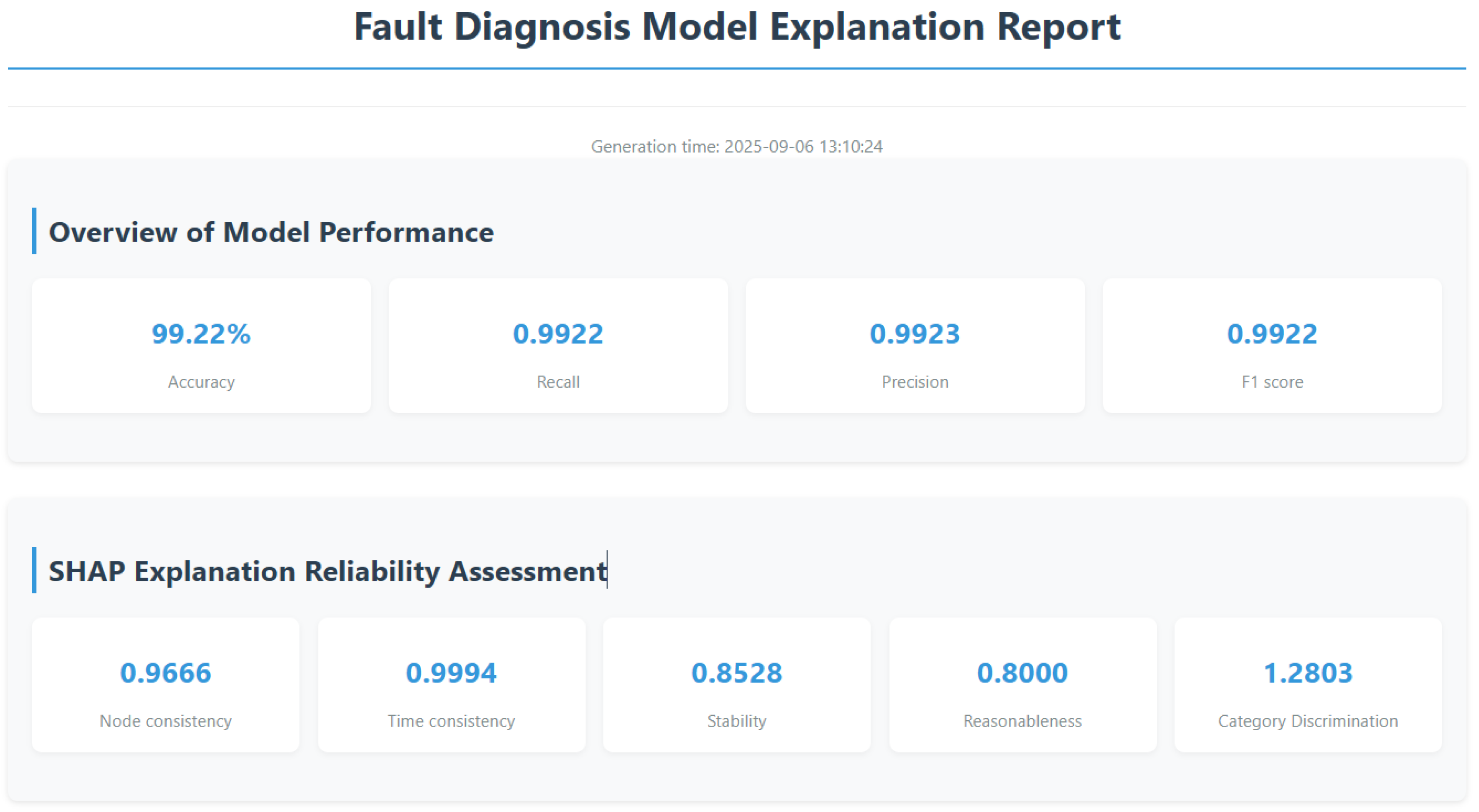 - The SHAP framework based on Deep Explainer is used to quantify the impact of diagnostic model input features on specific prediction results, achieving a dual visual interpretation of the model at both the global and local levels. Building on this, an innovative quantitative evaluation metric system for SHAP interpreters is proposed, addressing the critical issue of the lack of objective assessment standards for interpretation results in existing methods.
