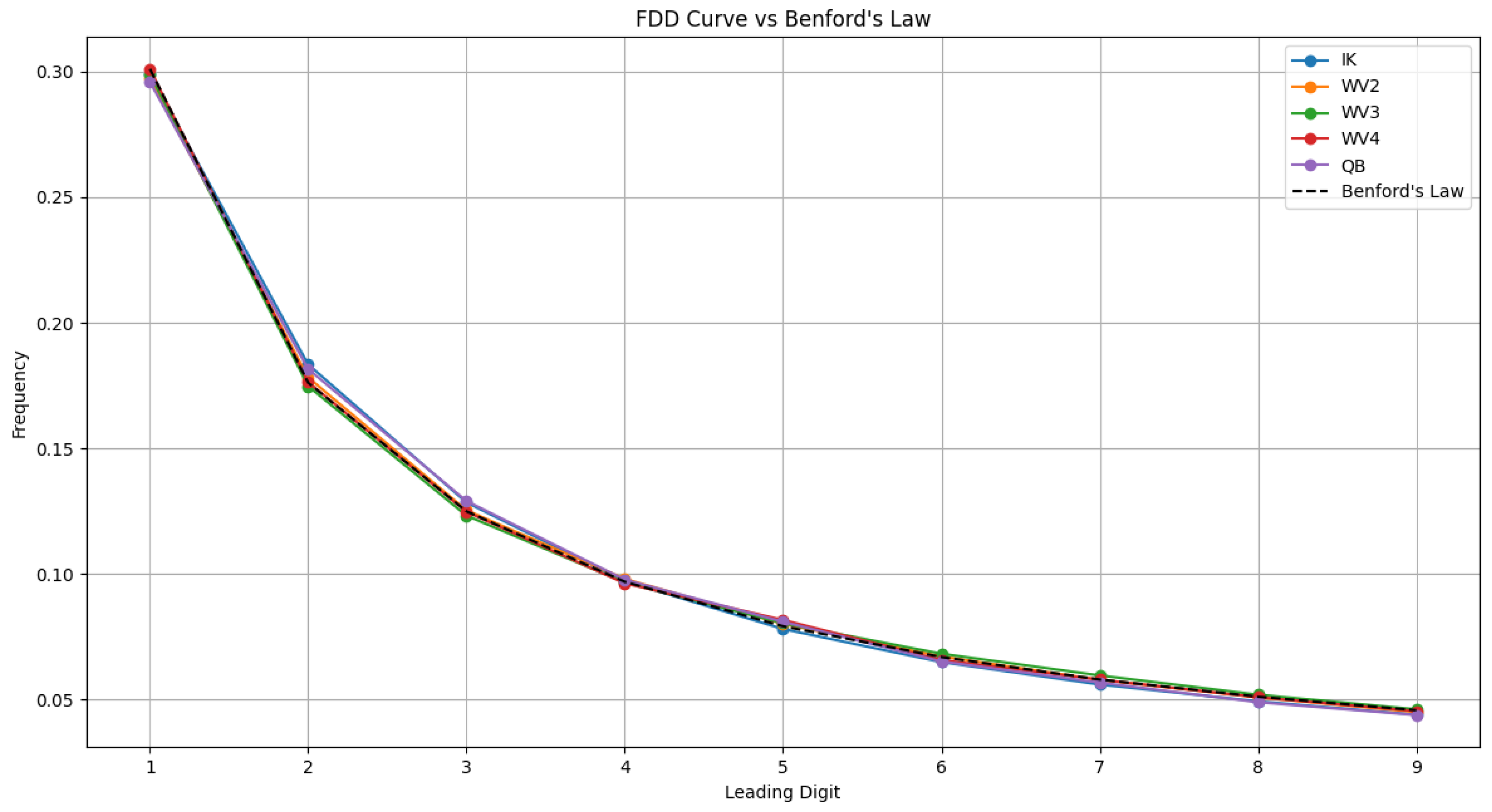 34] comprising imagery from sensors such as IKONOS (IK), WorldView-2 (WV-2), WorldView-3 (WV-3), and WorldView-4 (WV-4) reveal that pristine MS images adhere to statistical laws like Benford’s Law in their First Digit Distributions (FDDs) within hyperspherical color domains (HCDs), but fused images deviate markedly due to spectral alterations. Simulated distortions (e.g., hue shifts, saturation changes, non-linear intensity mismatches) further amplify these deviations, underscoring the need for metrics sensitive to such changes. Despite these insights, no dedicated NR metric exists that exclusively isolates spectral distortion while leveraging a comprehensive statistical model to capture both local and global spectral characteristics.