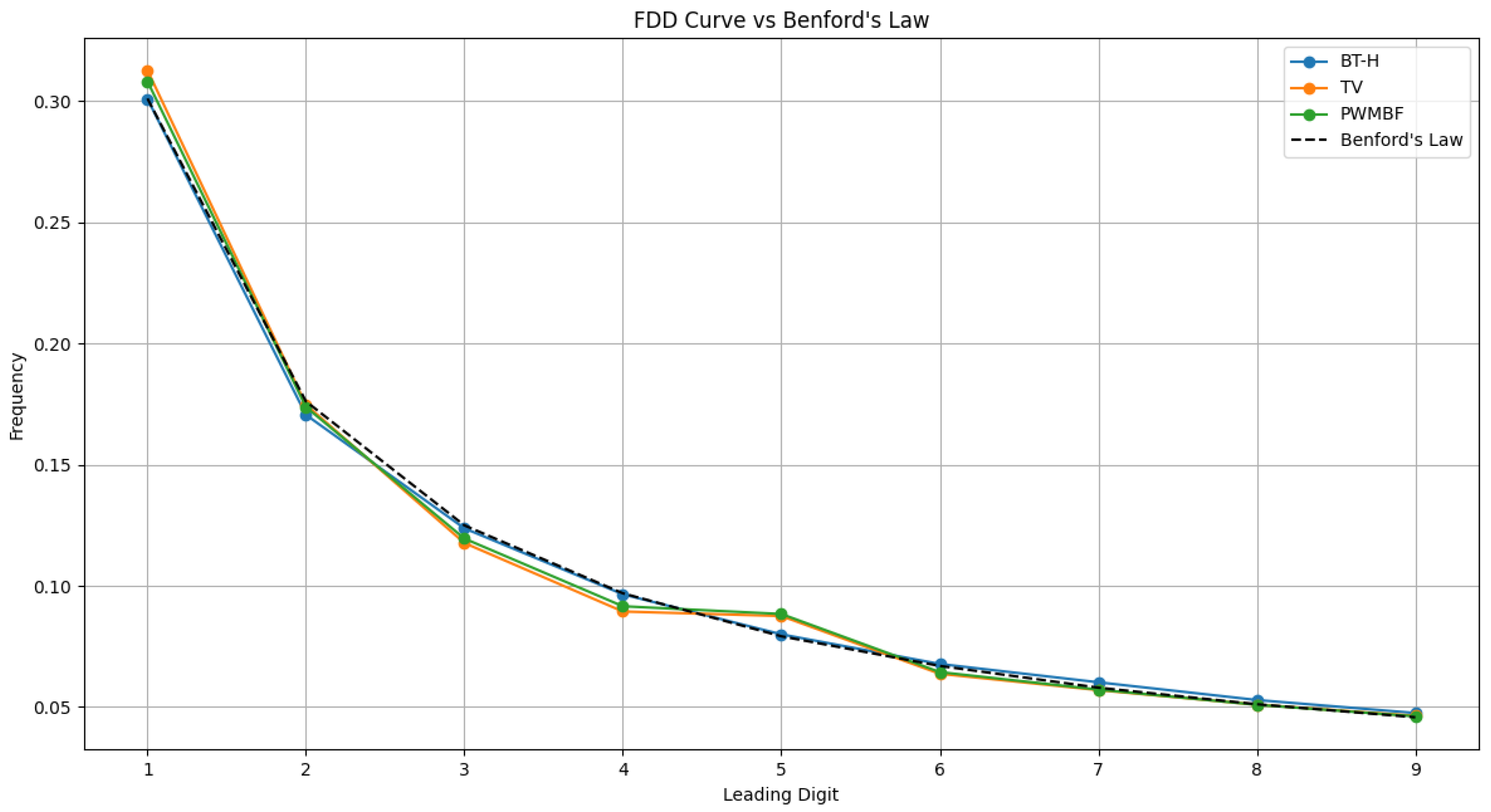 Figure 3 illustrates that once the same images are processed by fusion algorithms known to introduce spectral errors (such as the BT-H, TV, and PWMBF methods), their first digit frequencies deviate markedly. Similarly,