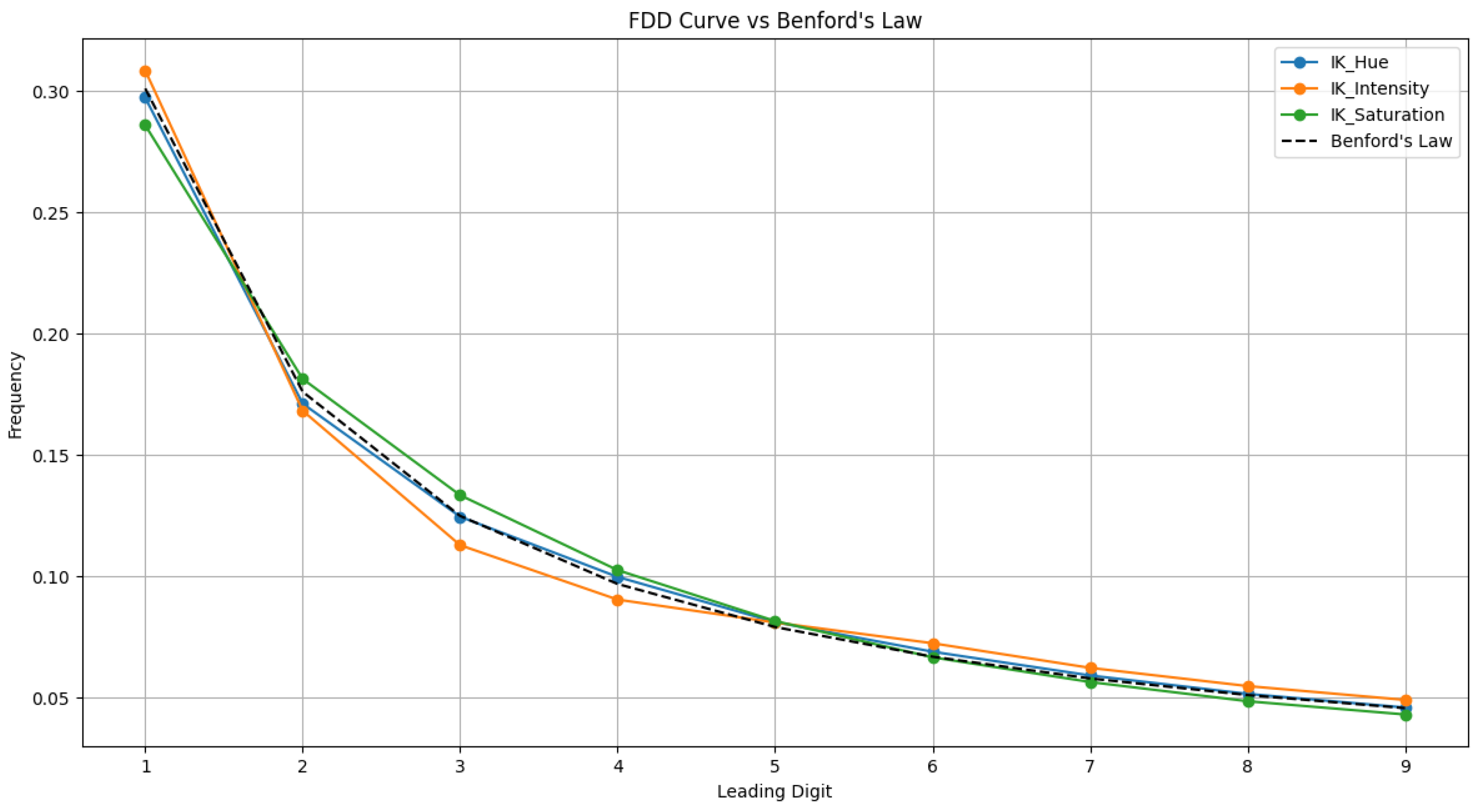 Figure 4 shows that simulated spectral degradations like hue, saturation, and non-linear intensity mismatch break the Benford pattern even more severely, causing the distribution to skew away from the theoretical curve. These distortions confirm that only pristine MS images in the HCD truly follow Benford’s Law; any filtering or spectrally altering processing disrupts the natural first digit statistics. Building on this, a nine-dimensional feature vector was extracted based on Benford’s Law to quantify spectral distortion.