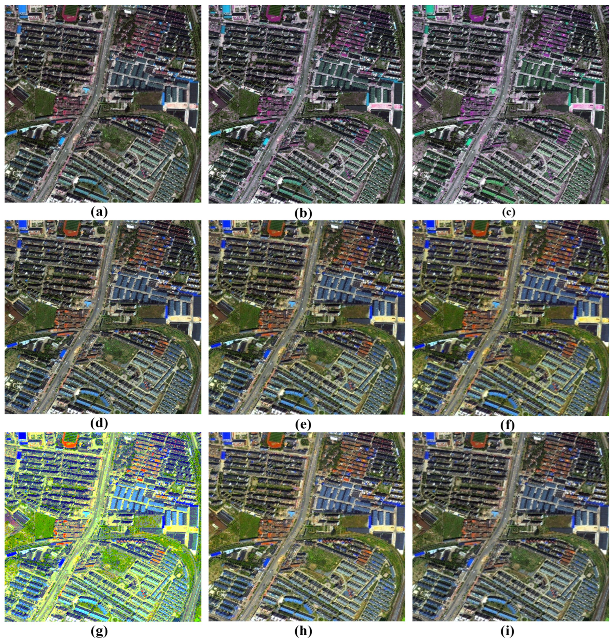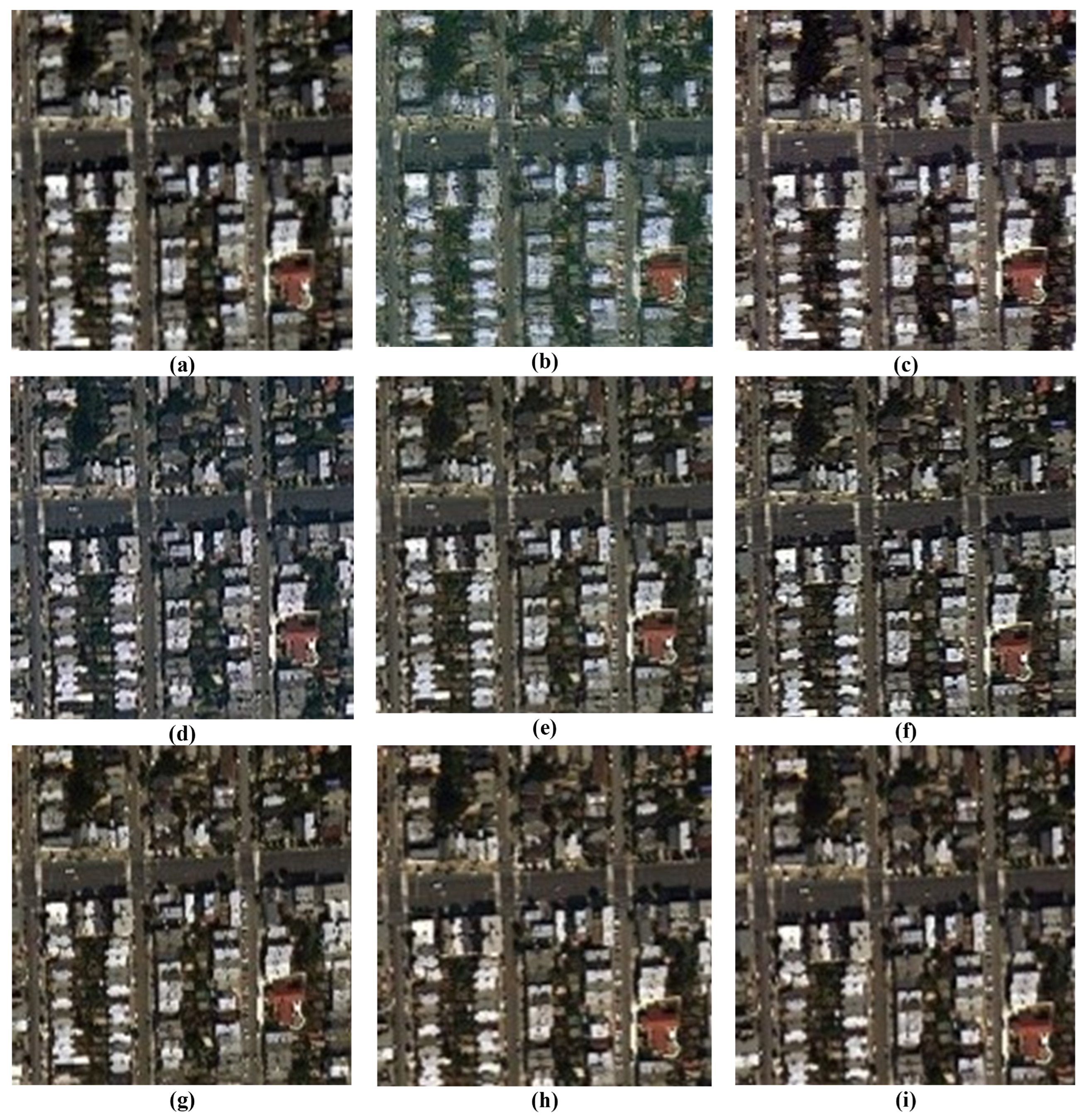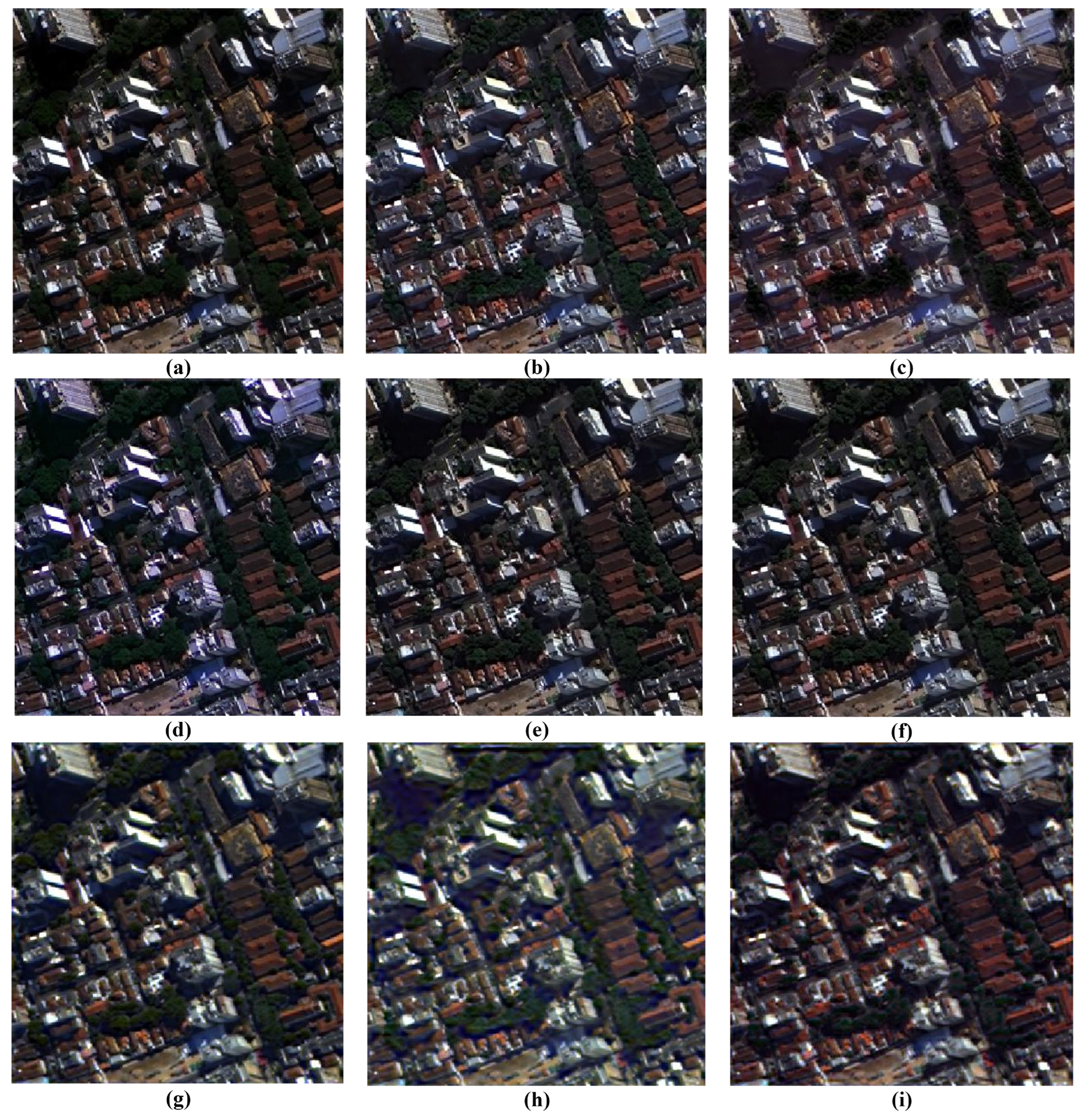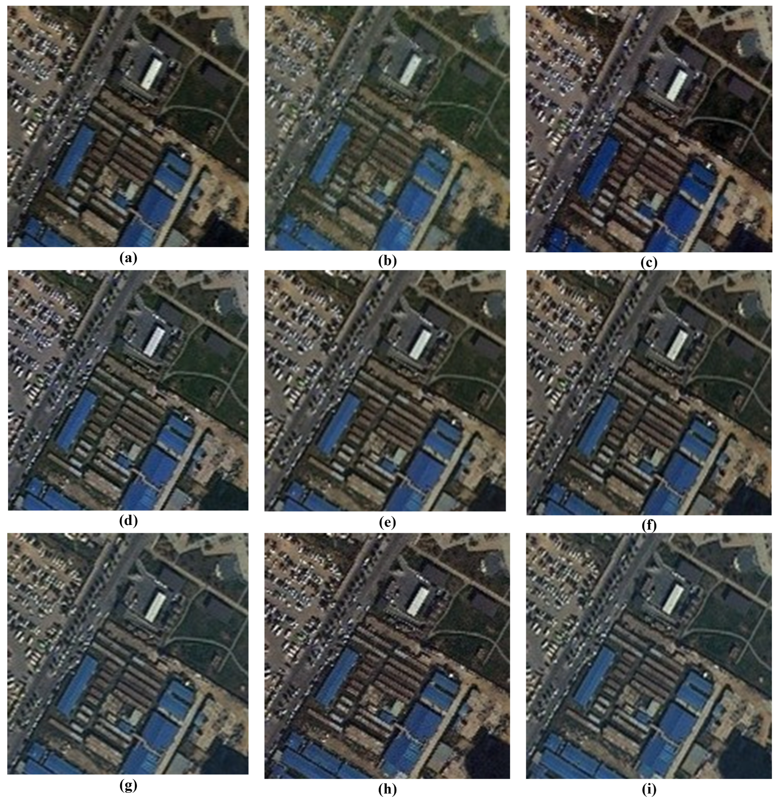 To validate this empirically, the average execution time across the entire IKONOS dataset, which comprises 200 images with a spatial resolution of pixels, was measured. All experiments were performed on a computer equipped with an Intel Core i5-1035G1 CPU @ 1.19 GHz and 16 GB of RAM, running on a 64-bit operating system. The algorithms were implemented in MATLAB R2024a.