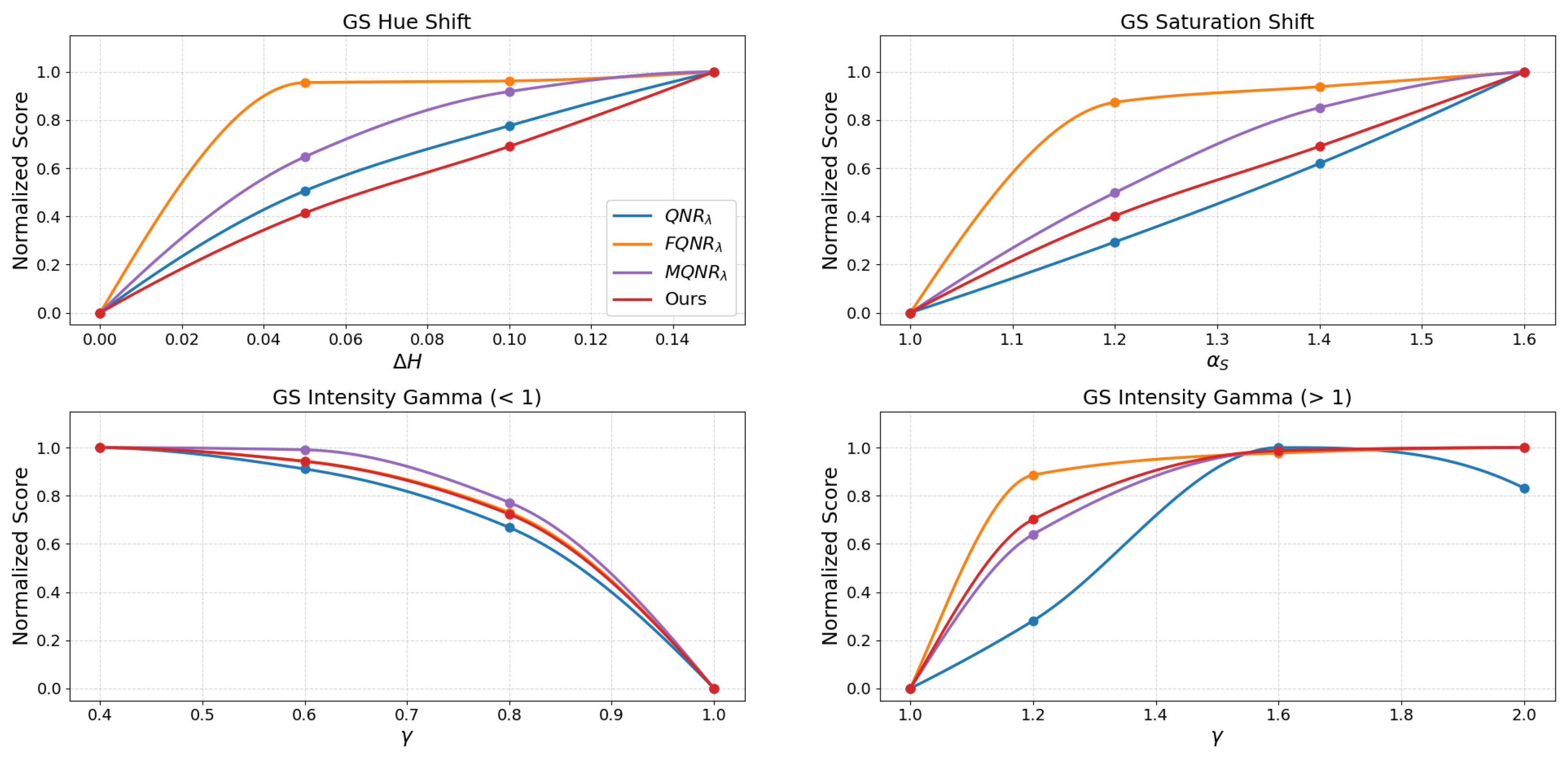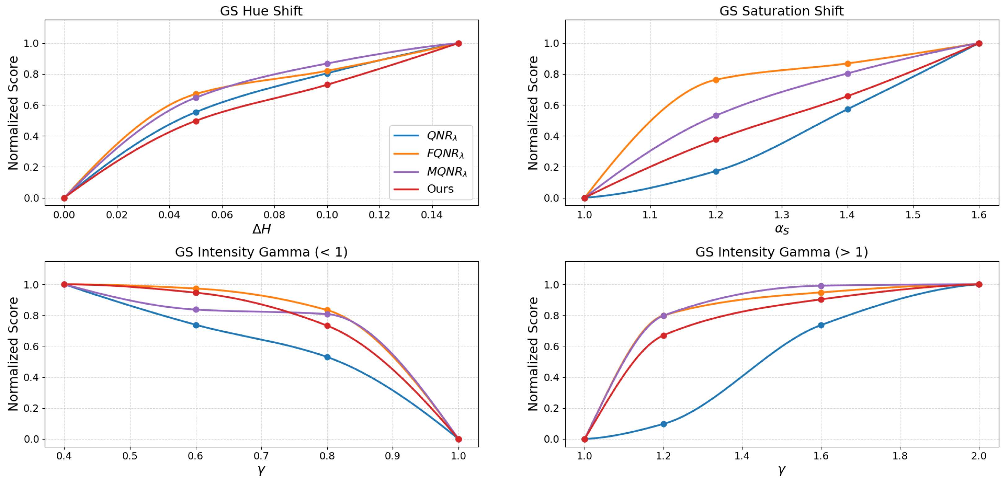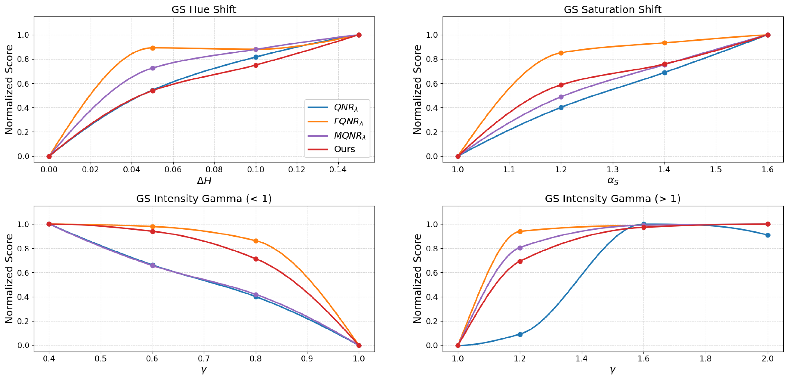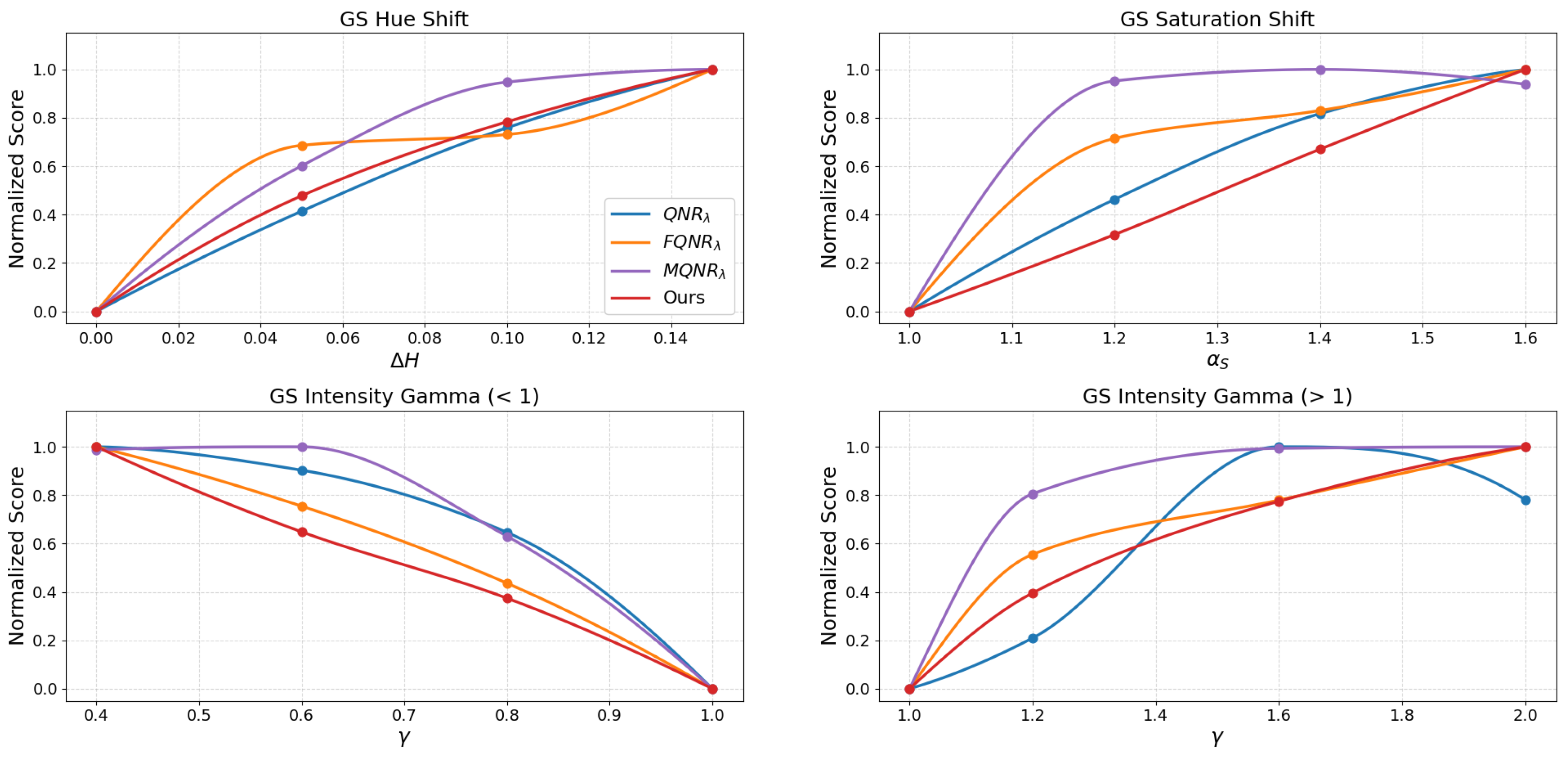 In the saturation shift analysis, the curve exhibits excessive sensitivity, marked by a steep initial spike to a near-maximum score (>0.8) at the lowest degradation level (), indicating premature saturation. In contrast, the proposed method follows a nearly linear trajectory with a consistent, gradual rise in penalty. Furthermore, in the intensity gamma evaluation (), standard displays a significant lack of sensitivity, remaining flat, whereas saturates rapidly. The proposed method avoids these extremes, yielding a balanced and monotonic curve that accurately reflects the increasing magnitude of degradation.