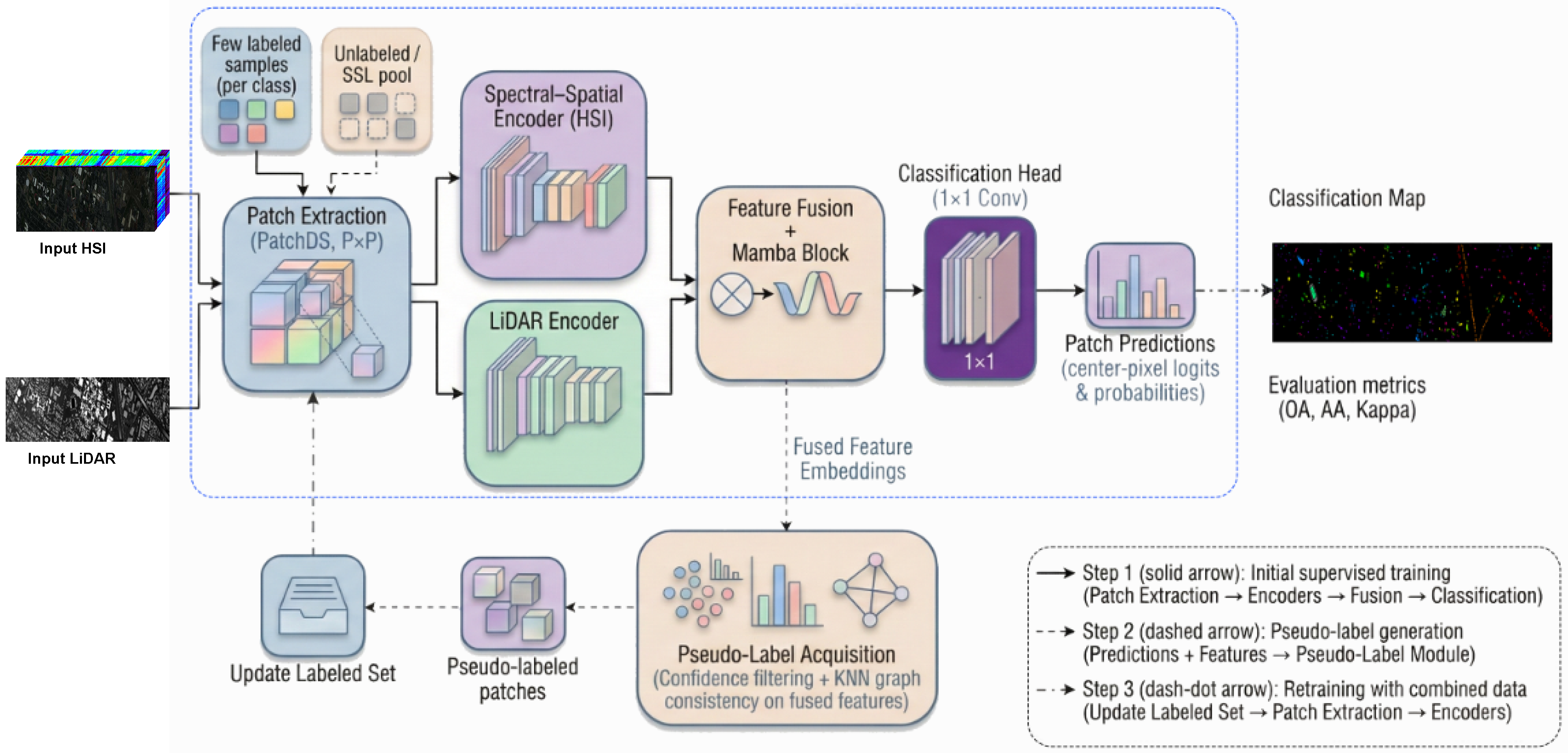 These observations collectively motivate the design of a unified architecture capable of addressing the interconnected challenges of multimodal learning under limited labels. Existing methods rarely combine spectral–spatial HSI encoding, LiDAR structural modeling, efficient long-range sequence learning, graph reasoning, and systematic pseudolabel refinement into a single coherent framework. Moreover, multimodal SSL remains vulnerable to inconsistent pseudolabel predictions, which can propagate uncertainty and destabilize training. Additionally, high-dimensional hyperspectral sequences require an efficient long-range modeling approach that avoids the computational burden of transformers. These challenges form the foundation for our proposed methodology.