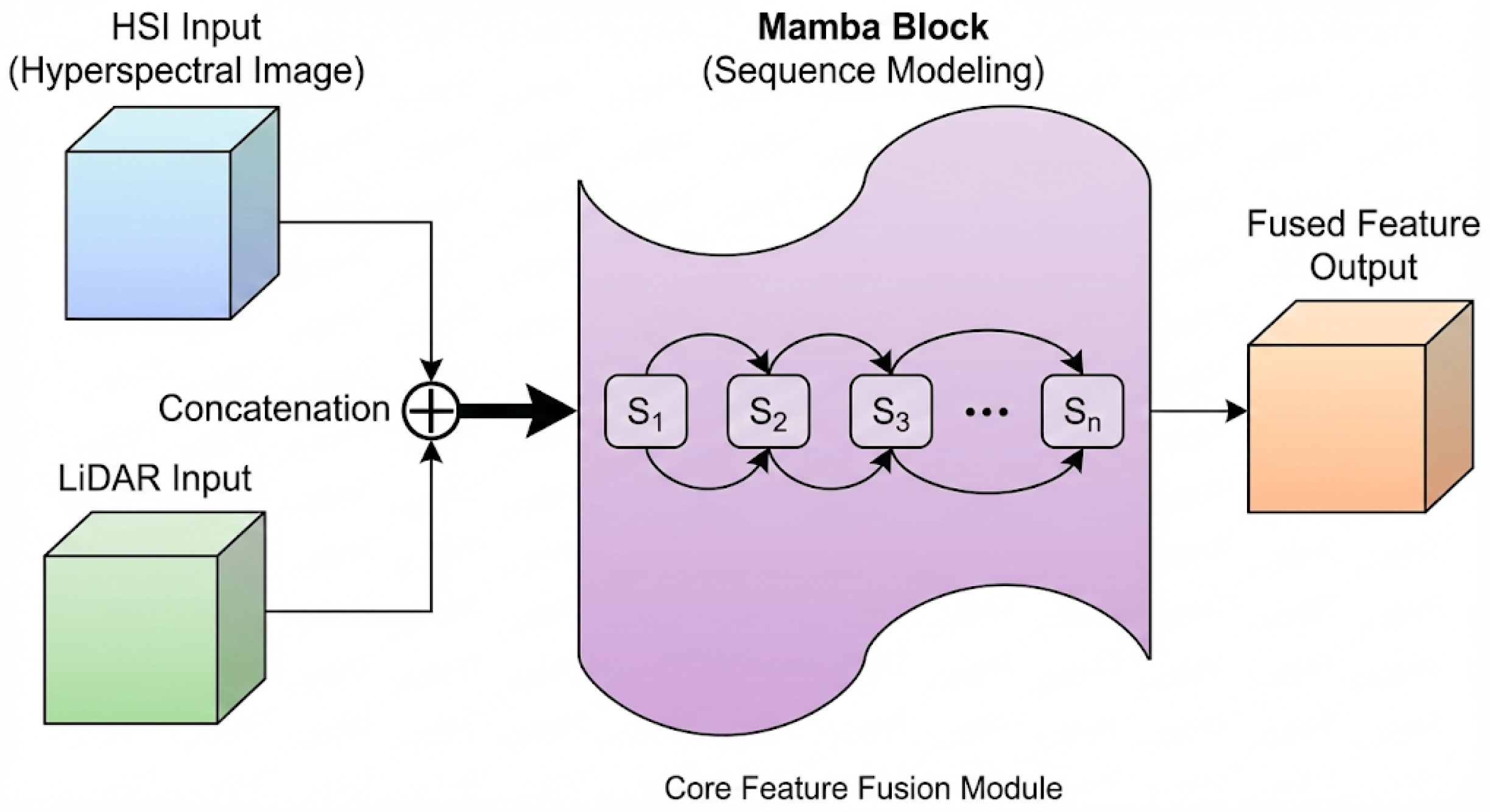 We present HMGF-Net, a unified multimodal architecture that integrates a 3D–2D spectral–spatial CNN encoder for hyperspectral data, a multiscale CNN for LiDAR elevation modeling, and Mamba-based selective state-space modeling for efficient long-range dependency learning. This design combines local spectral–spatial feature extraction with global sequence modeling, enabling a more expressive and computationally efficient multimodal representation than conventional CNN- or transformer-based approaches.