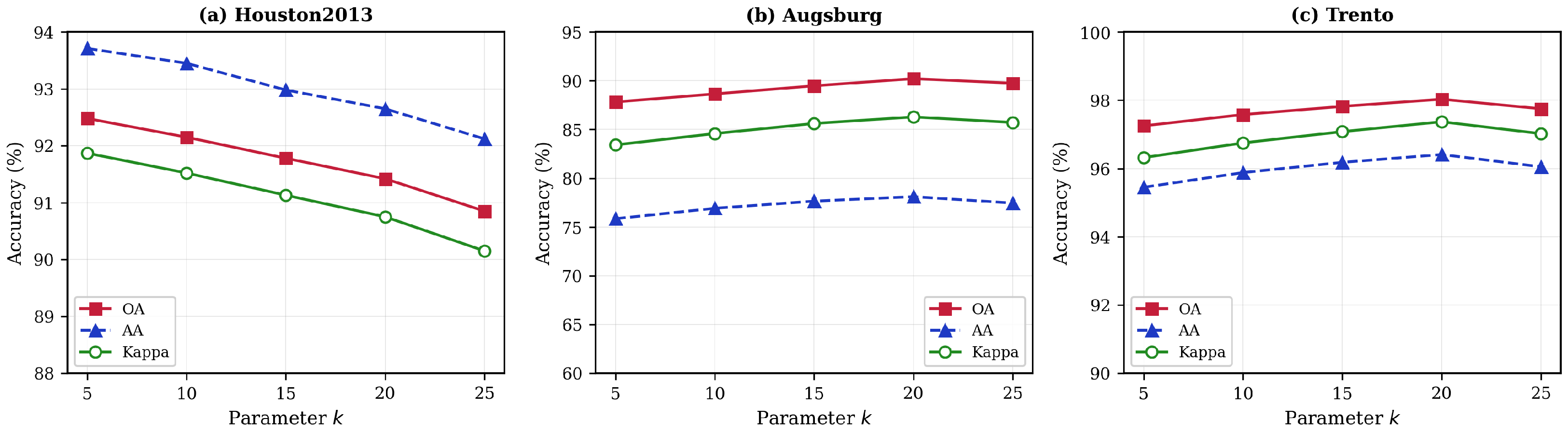 For Houston2013, optimal performance is achieved at (OA: 92.30%). This is attributed to its high spatial resolution (2.5 m), where neighboring pixels are more likely to belong to the same category within a compact neighborhood. In contrast, Augsburg and Trento achieve optimal results at , reflecting their larger homogeneous regions that benefit from broader neighborhood context. These results demonstrate that optimal k is dataset-dependent and should be tuned based on spatial characteristics.