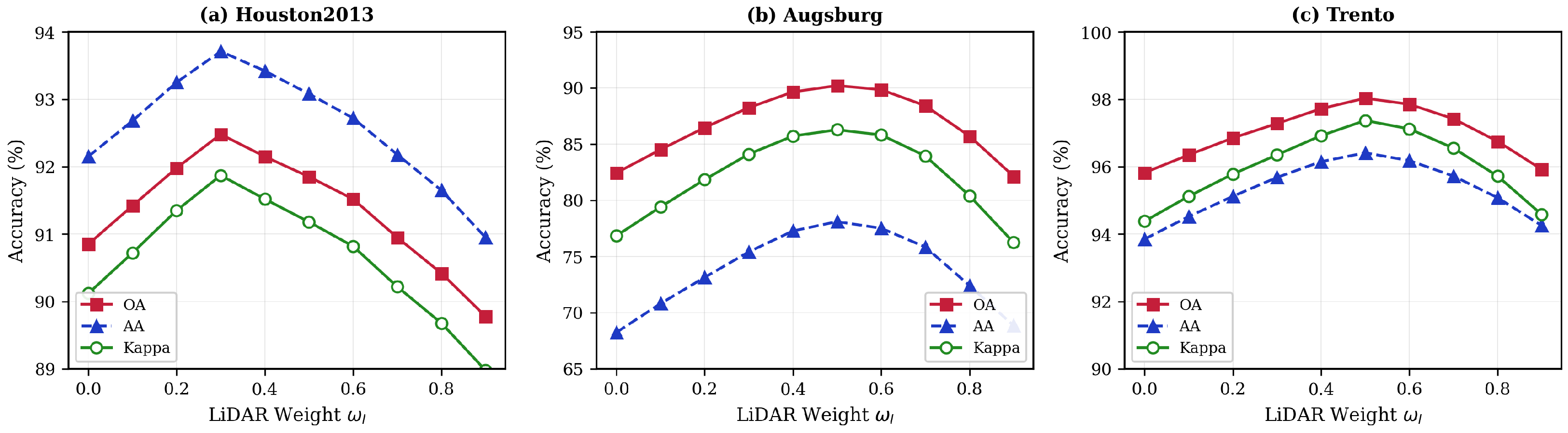 For Houston2013, optimal performance occurs at , indicating that spectral information dominates for distinguishing diverse urban categories. For Augsburg and Trento, balanced fusion () yields the best results, as elevation information provides crucial discriminative features for separating vegetation types and distinguishing buildings. Performance degradation at extreme weights ( or ) confirms the importance of multimodal fusion.