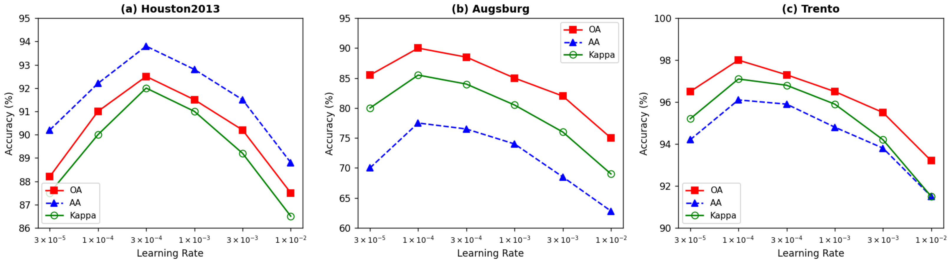 The larger optimal learning rate for Houston2013 may be attributed to its complex fifteen-class feature space requiring more aggressive parameter updates. Excessively large learning rates () cause significant performance degradation across all datasets, particularly for Augsburg (OA drops to 75.82%) due to its severe class imbalance. We recommend learning rates in the range for similar HSI-LiDAR classification tasks.