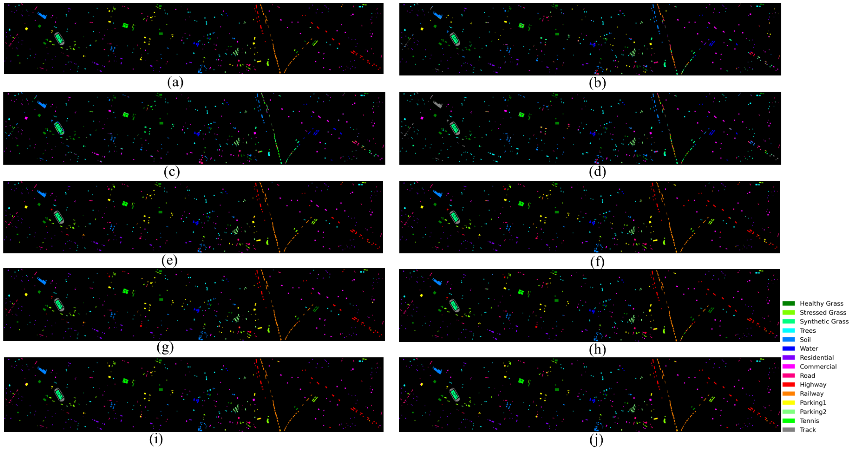 Houston2013 dataset. The Houston2013 dataset was captured using the ITRES CASI-1500 (ITRES Research Limited, Calgary, AB, Canada) sensor over the University of Houston campus and its surrounding urban area in Houston, Texas, USA in 2012. This dataset includes both HSI and LiDAR DSM data. The spatial dimensions of the dataset are 349 × 1905, with a spatial resolution of approximately 2.5 m. The HSI data consist of 144 spectral bands, covering the wavelength range from 380 to 1050 nm. The LiDAR data provide elevation information for ground features. The land cover is categorized into fifteen types: Healthy Grass, Stressed Grass, Synthetic Grass, Trees, Soil, Water, Residential, Commercial, Road, Highway, Railway, Parking Lot 1, Parking Lot 2, Tennis Court, and Running Track.