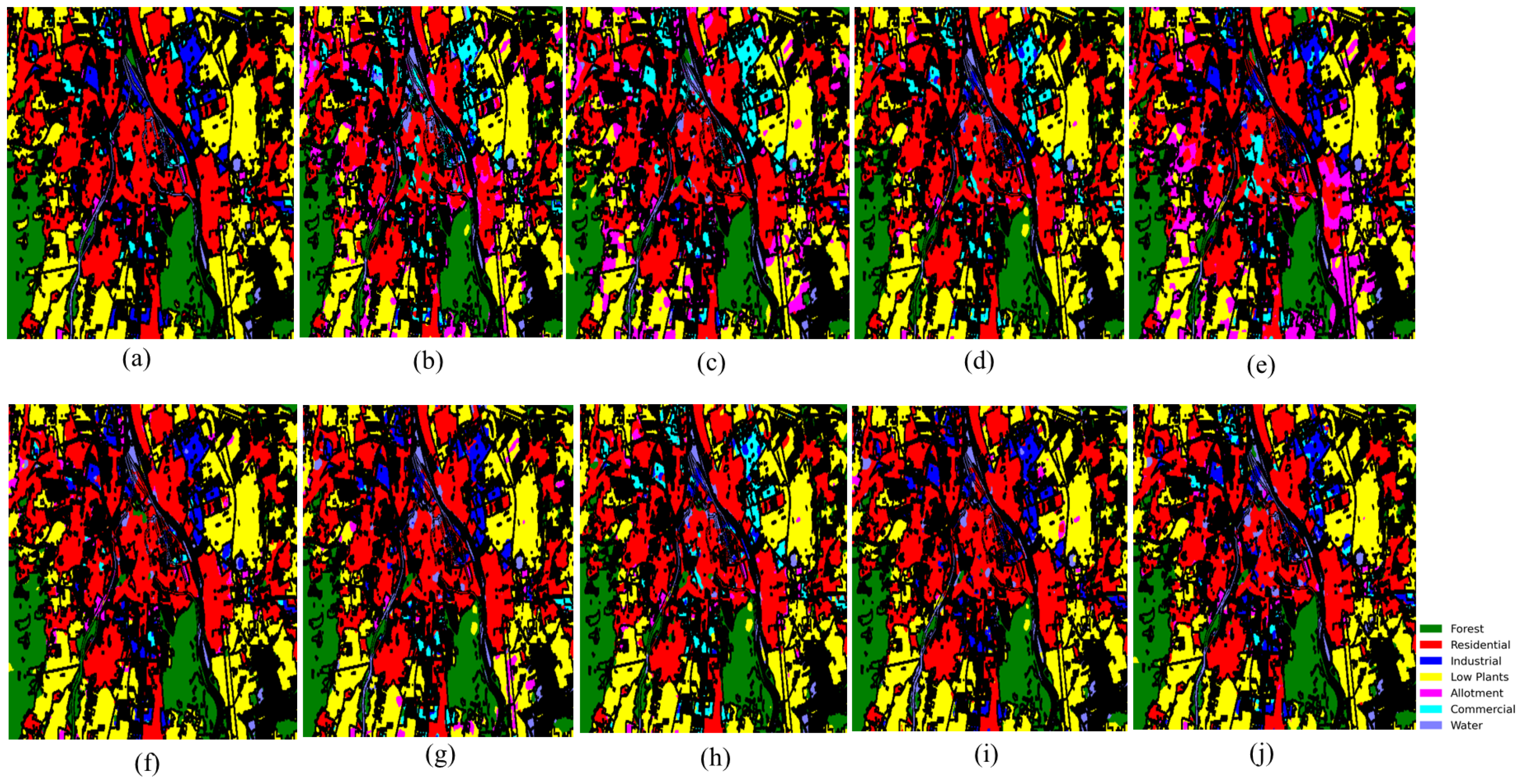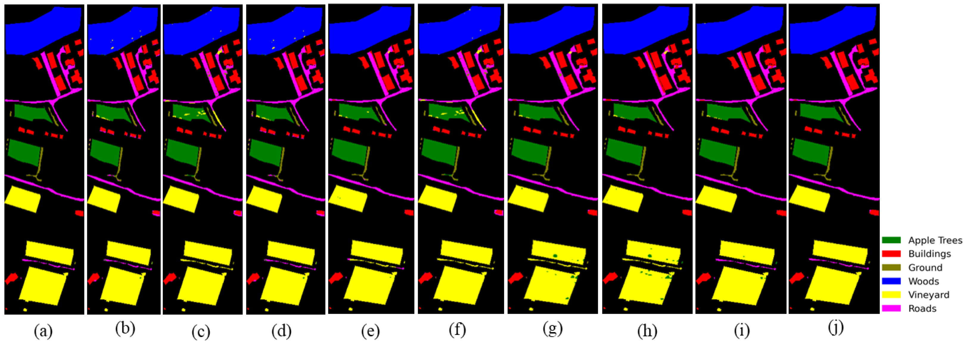 Figure 10 present visual classification maps for all three datasets. Compared to baseline methods, HMGF-Net produces smoother regions, cleaner class boundaries, and fewer isolated misclassifications.