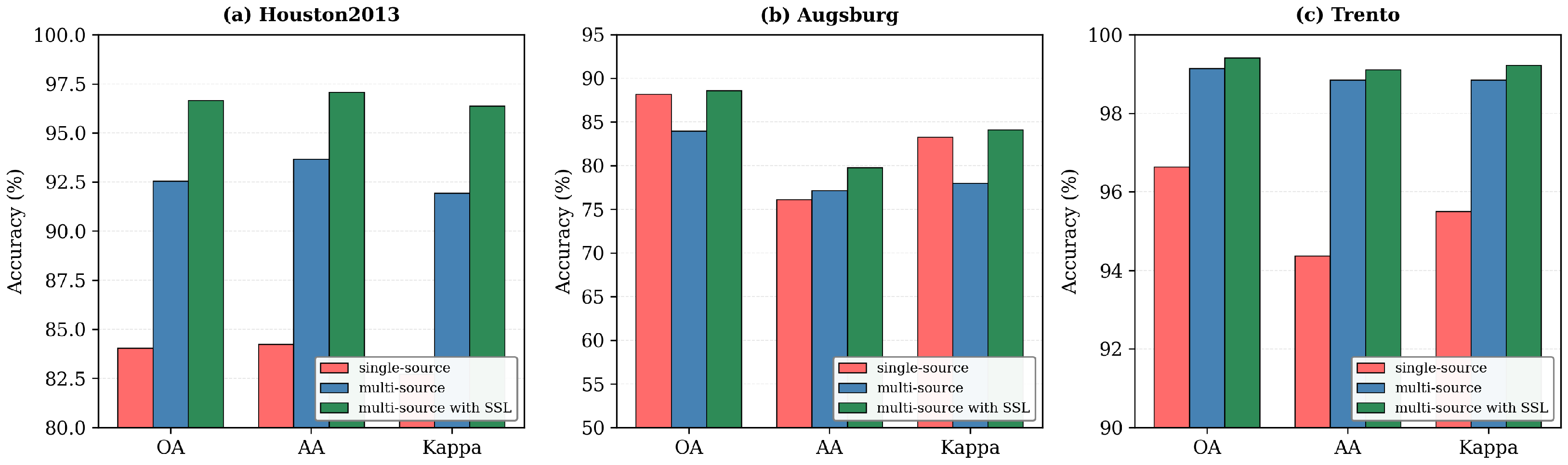 The experimental results across the Houston2013, Augsburg, and Trento datasets confirm that HMGF-Net with MS-PLR offers substantial advantages in multimodal semi-supervised learning. Through its combination of spectral–spatial encoding, Mamba-based sequence modeling, graph-regularized fusion, and progressive pseudolabel refinement, the proposed framework delivers robust performance under limited annotation, consistently surpassing state-of-the-art methods across all datasets and evaluation metrics.