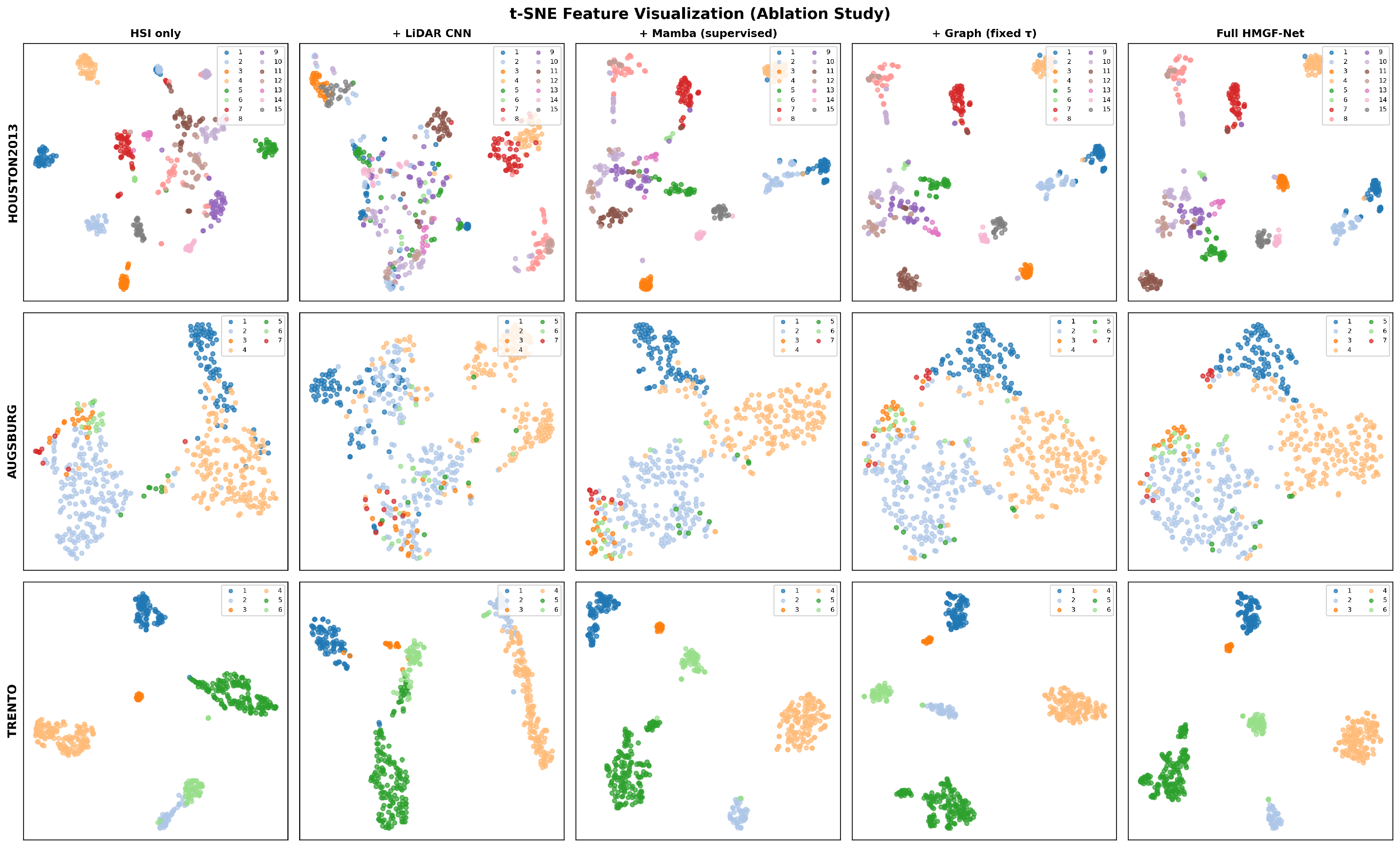 On Houston2013, HMGF-Net exhibits improved discrimination along road networks and parking lot boundaries, where spectral confusion is prevalent. The Augsburg results show enhanced separation between residential and commercial areas, benefiting from the elevation-aware fusion mechanism. On Trento, the agricultural parcel boundaries are sharply delineated, demonstrating effective utilization of both spectral signatures and terrain structure.