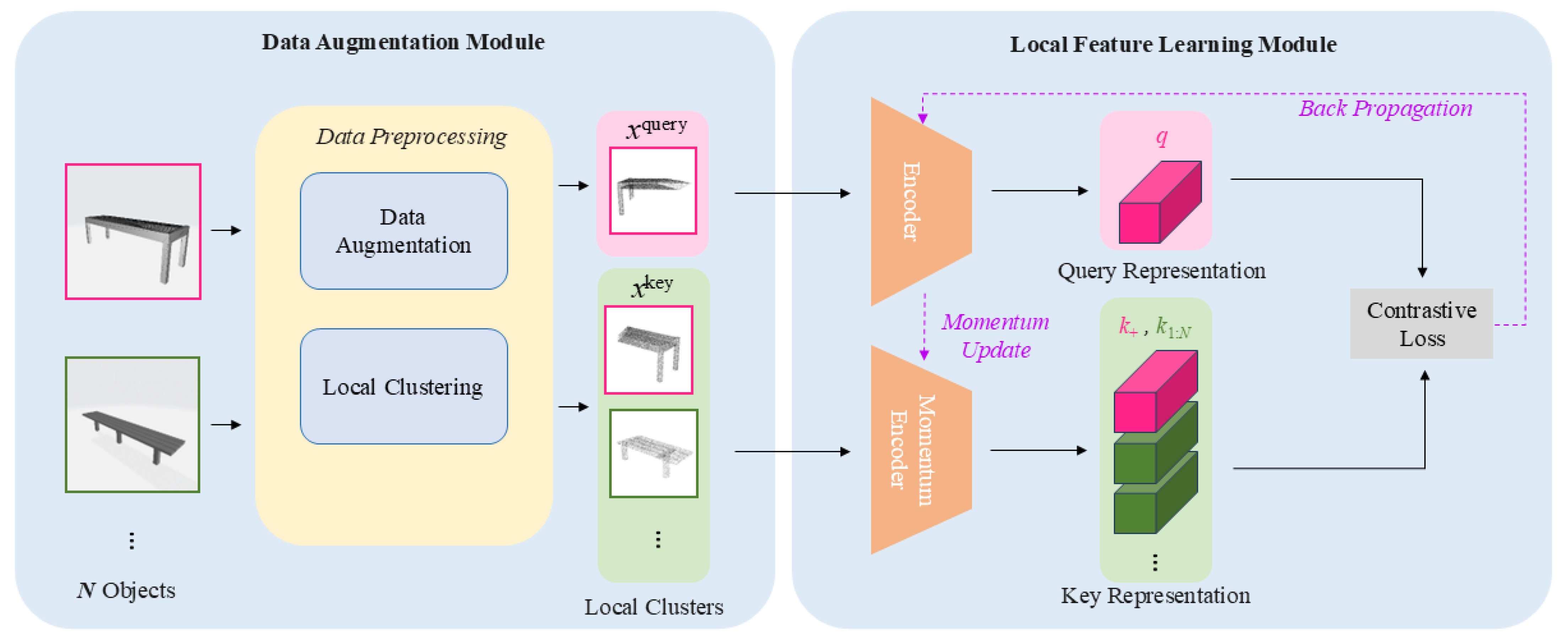 Figure 2. The architecture consists of two primary modules: a data augmentation module and a local feature learning module. The data augmentation module processes input 3D point clouds into transformed local clusters that serve as queries and keys. The local feature learning module then learns discriminative local features from these query and key clusters through contrastive learning.