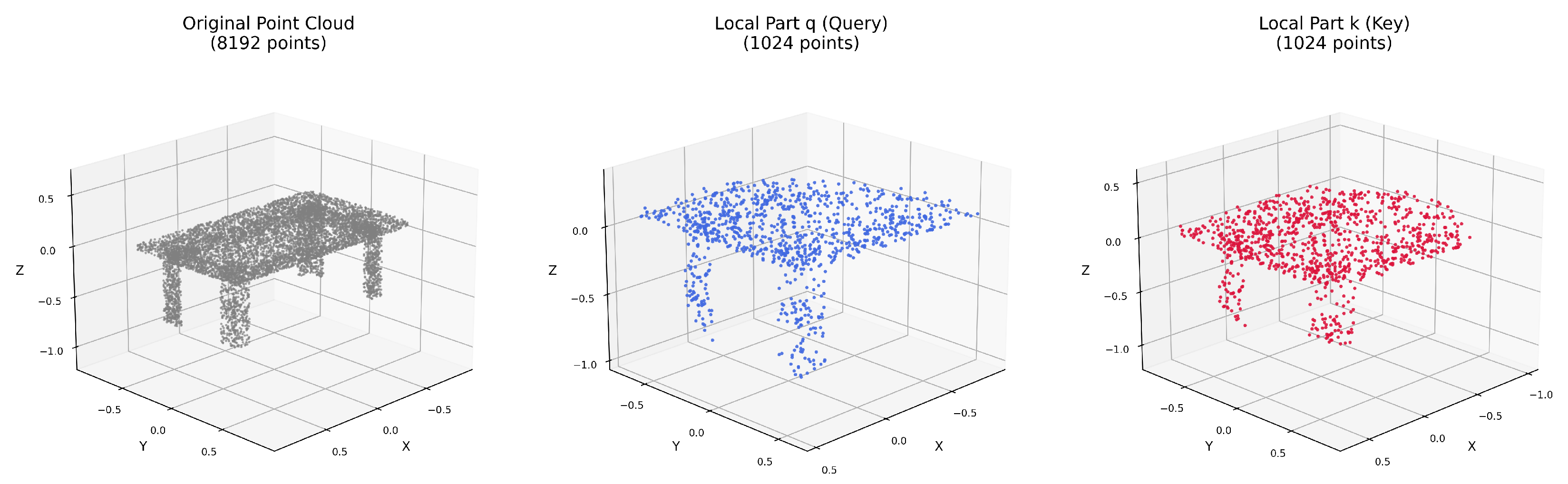 Figure 3 illustrates the sampled query and key local parts from the original point cloud after local clustering method. By sampling local clusters in this manner, we can generate multiple views of local parts from a single point cloud, each representing different geometric patterns and structural characteristics. This random sampling strategy enables the model to learn from varied geometric local part configurations, enhancing its ability to recognize partial shapes and local information in downstream tasks.