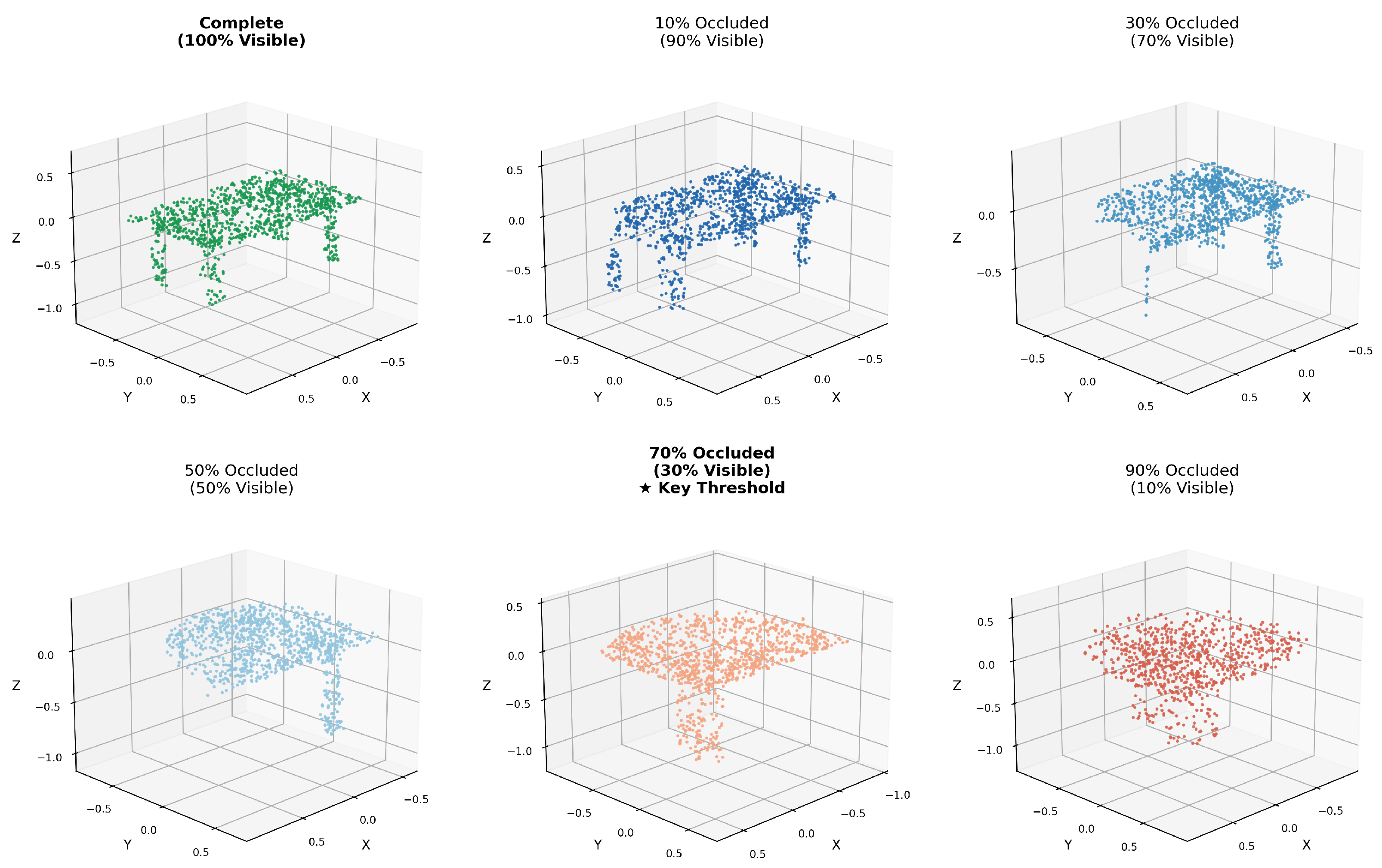 The PointNet++ backbone employed in our framework incorporates multi-scale grouping operations that provide inherent resilience to point density variations through adaptive neighborhood aggregation. Regarding the 30% visibility threshold, this boundary carries practical significance: when less than 30% of an object remains visible, the geometric information typically becomes too fragmented to maintain semantic recognizability. This threshold represents a fundamental limitation imposed by information availability rather than a model-specific constraint. For realistic scenarios with sensor noise, variable density, and occlusion artifacts, this 30% boundary establishes a clear performance expectation, indicating when sensor fusion or multi-view integration becomes necessary.