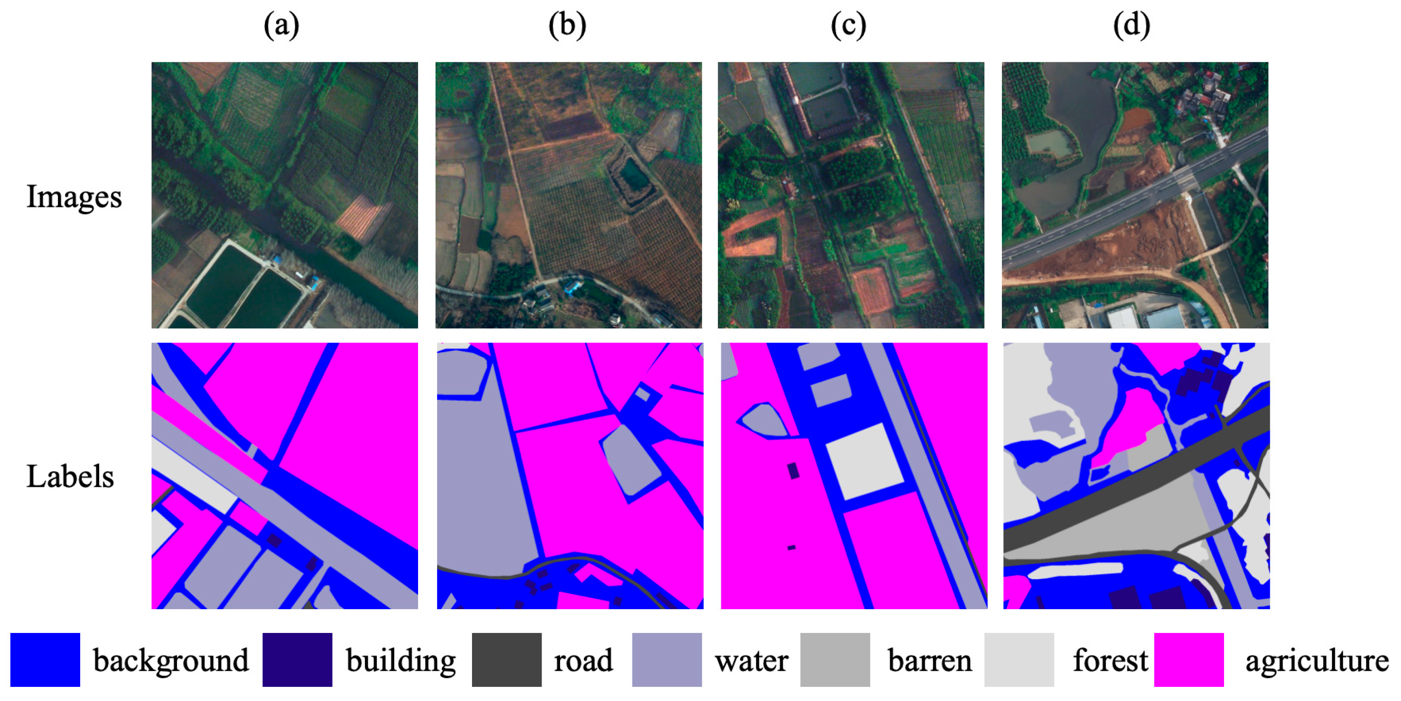- Wang, J.; Zheng, Z.; Ma, A.; Lu, X.; Zhong, Y. LoveDA: A remote sensing land-cover dataset for domain adaptive semantic segmentation. arXiv 2021, arXiv:2110.08733. [Google Scholar]