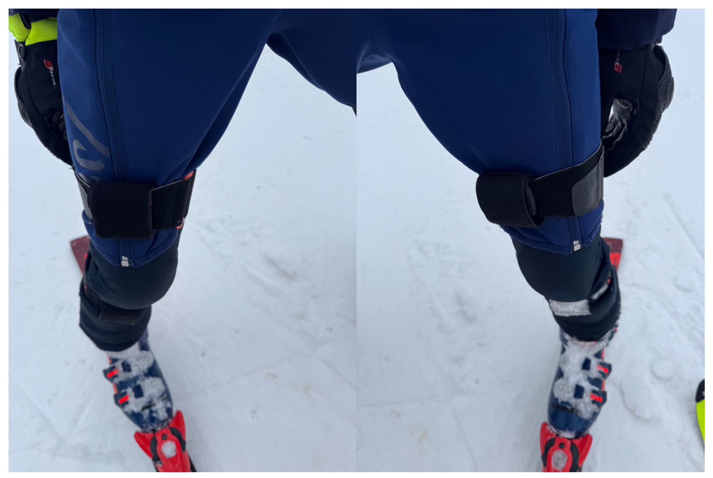 To complement spatial data with biomechanical insight, XSensDOT inertial measurement units (IMUs) were mounted bilaterally on the thigh and shin, and in the lumbar region. Sensors recorded tri-axial acceleration and angular displacement at 60 Hz, enabling detailed analysis of segmental kinematics—particularly knee flexion—and trunk behavior during turns. The importance of sensor placement and orientation for IMU accuracy in skiing has been emphasized in the recent literature [