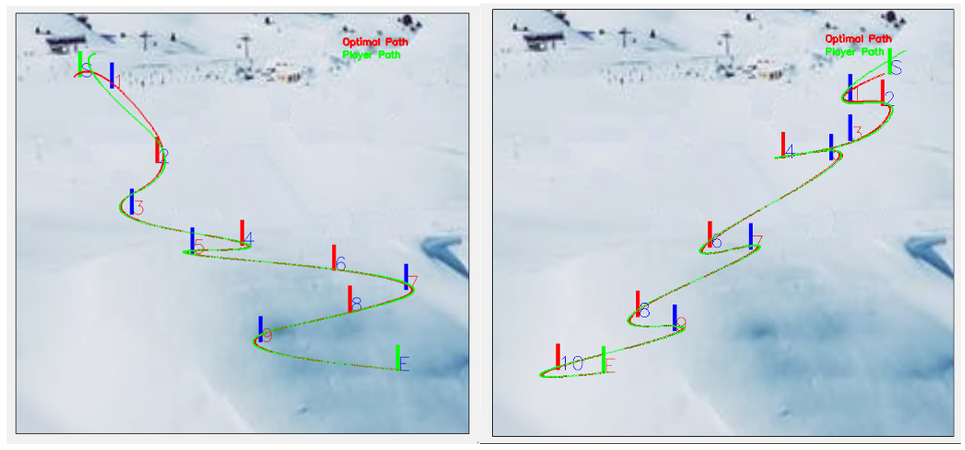 Trajectory analysis was performed using OptiPath, a Python-based desktop application developed for this study. OptiPath integrates computer-vision algorithms with geometric modeling to automatically detect gates and extract skier paths, building on advances in markerless motion capture and pose estimation [