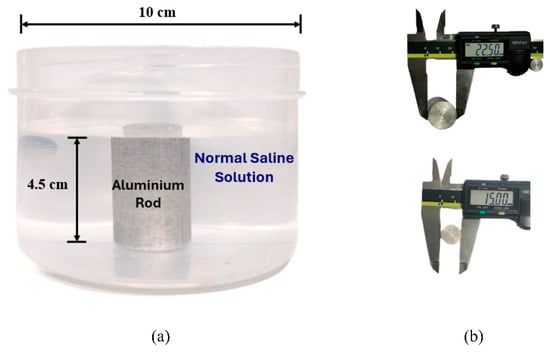 (a) Side view of the phantom. (b) Measurements of the aluminum inclusions using a digital caliper (all values are in mm).