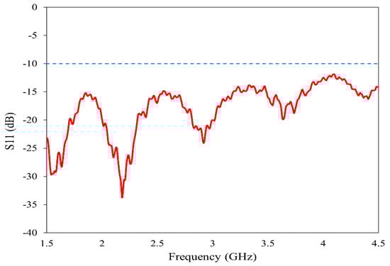 The horn antenna (model no: AN 07 047 10 050) is utilized for the proposed imaging. The double-ridged horn antenna has an operating frequency range of 800 MHz to 18 GHz with a gain varying from 4 dBi to 20 dBi. To ensure the suitability of this antenna for our imaging method, we have experimentally analyzed its various characteristics. The reflection coefficient, gain and radiation pattern are measured using the Keysight N5227B Vector Network Analyzer (VNA) (Keysight Technologies, Santa Rosa, CA, USA) in the near-field setup prior to imaging. The operating band is selected from 1.5 GHz to 4.5 GHz to provide a balance between resolution and penetration depth [35,36]. The reflection characteristics of the antenna in the band of study are plotted in Figure 3. In the entire frequency range 2:1 VSWR is maintained, allowing for the data acquisition from the reflection coefficient.
