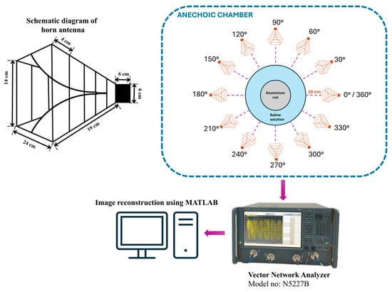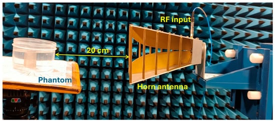 The experiment is designed to assess the location and area of the tumor from the designed phantom. Reflection coefficients obtained from the horn antenna are used to specify tumor characteristics with the aid of the image reconstruction algorithm. The antenna configuration follows a monostatic approach, where the antenna remains stationary. The antenna is positioned 20 cm from the phantom, falling within the near-field region. This is desirable to reconstruct images with a high resolution, even for small-sized anomalies. For the present analysis, we use a multi-view acquisition system capable of acquiring data from 12 angular positions with a vector network analyzer (VNA). This is achieved by rotating the phantom in 30° increments. The operating frequency varies from 1.5 GHz to 4.5 GHz, sampled at 502 points. The output power of the VNA (Keysight N5227B) is set to 0 dBm (1 mW). All measurements are conducted in an anechoic chamber to ensure minimum external interference. The schematic representation of the experimental setup for the microwave image reconstruction is shown in Figure 6, where different viewing angles are represented by multiple antenna icons around the phantom. The detailed photograph of actual experimental setup inside the anechoic chamber is shown in Figure 7.