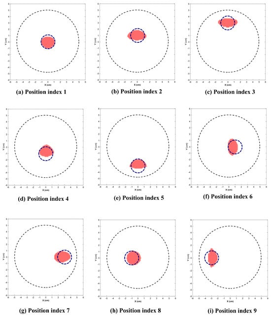 This section presents the visually reconstructed images at each position after segmentation. The following results compare the visual quality of the reconstructed images for two sizes of inclusion at nine positions each. In these images, red is represented by the reconstructed tumor and the dotted blue circle represents the ground truth. The black dotted circle represents the size of the phantom (diameter of 5 cm). The X-axis and Y-axis represent the spatial coordinates (in cm) across the imaging plane of the phantom.