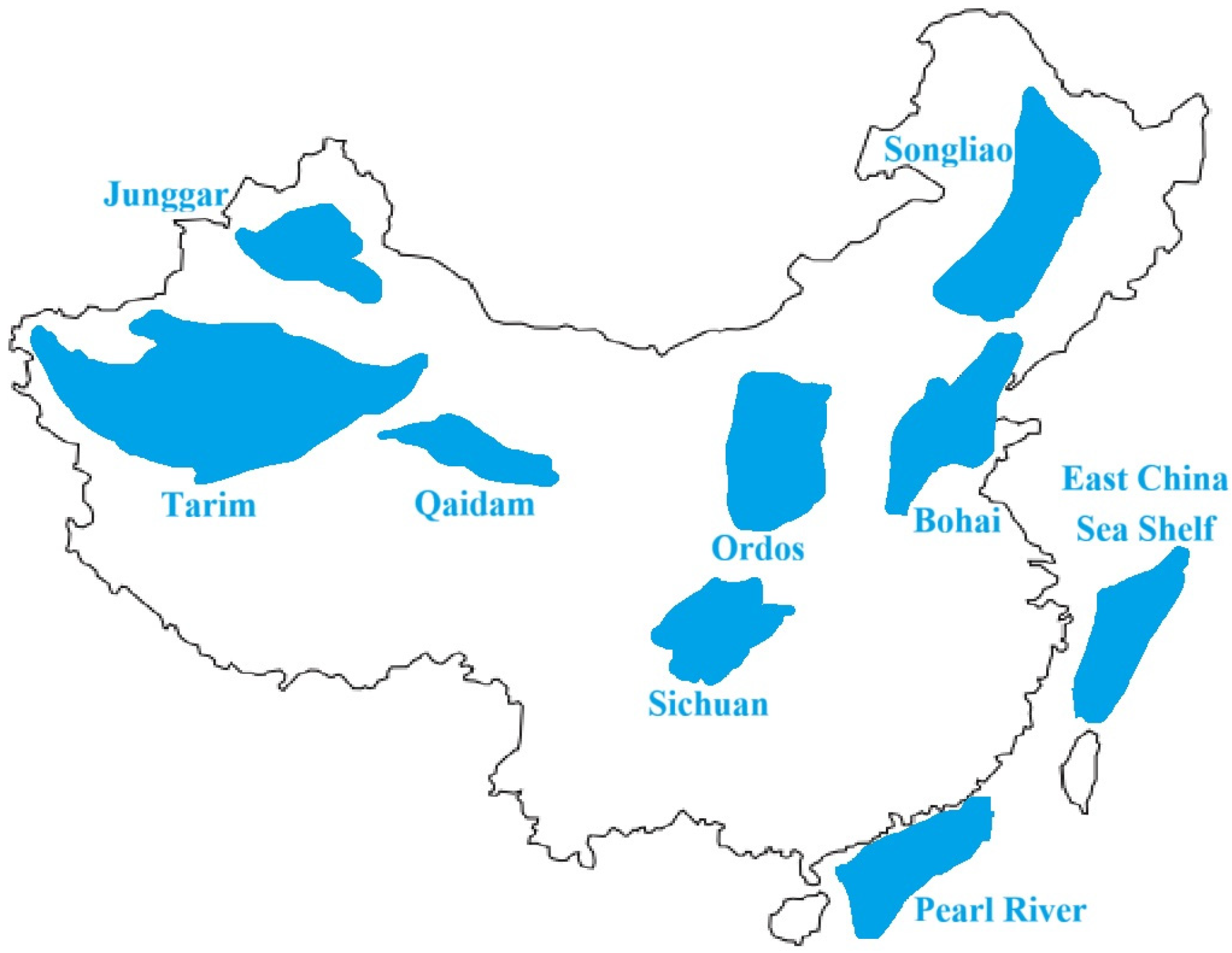 - Xiaozhi, W.U.; Xiaoxue, L.; Jian, W.; Min, Z.; Xiaoming, C.; Xuefeng, Q. Petroleum resource potential, distribution and key exploration fields in China. Earth Sci. Front. 2022, 29, 146–155. [Google Scholar] [CrossRef]