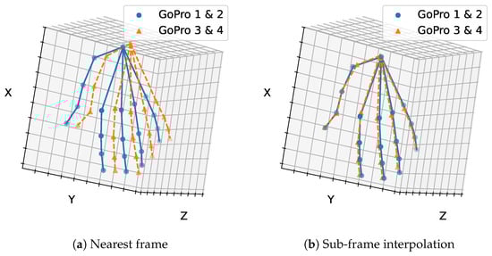 Qualitative comparison of 3D hand reconstructions obtained (a) with nearest-frame synchronization and (b) with sub-frame synchronization (triangulation from GoPro 3 and 4), for the scene shown in Figure 5a (left hand). The nearest-frame approach produces noticeable discrepancies in hand shape, whereas sub-frame synchronization yields a reconstruction consistent with the true hand configuration.