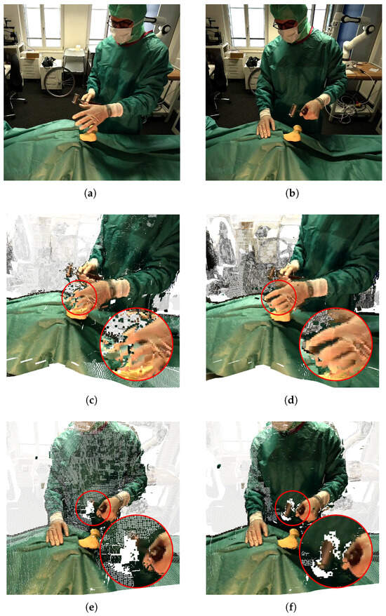 Finally, we present a qualitative comparison with and without sub-frame synchronization in Figure 4a,b, respectively, associated with the scene shown at the top of Figure 5a. We observe a clear discrepancy in hand shape under the nearest-frame strategy, whereas the sub-frame synchronization case produces a reconstruction consistent with the actual hand shape.