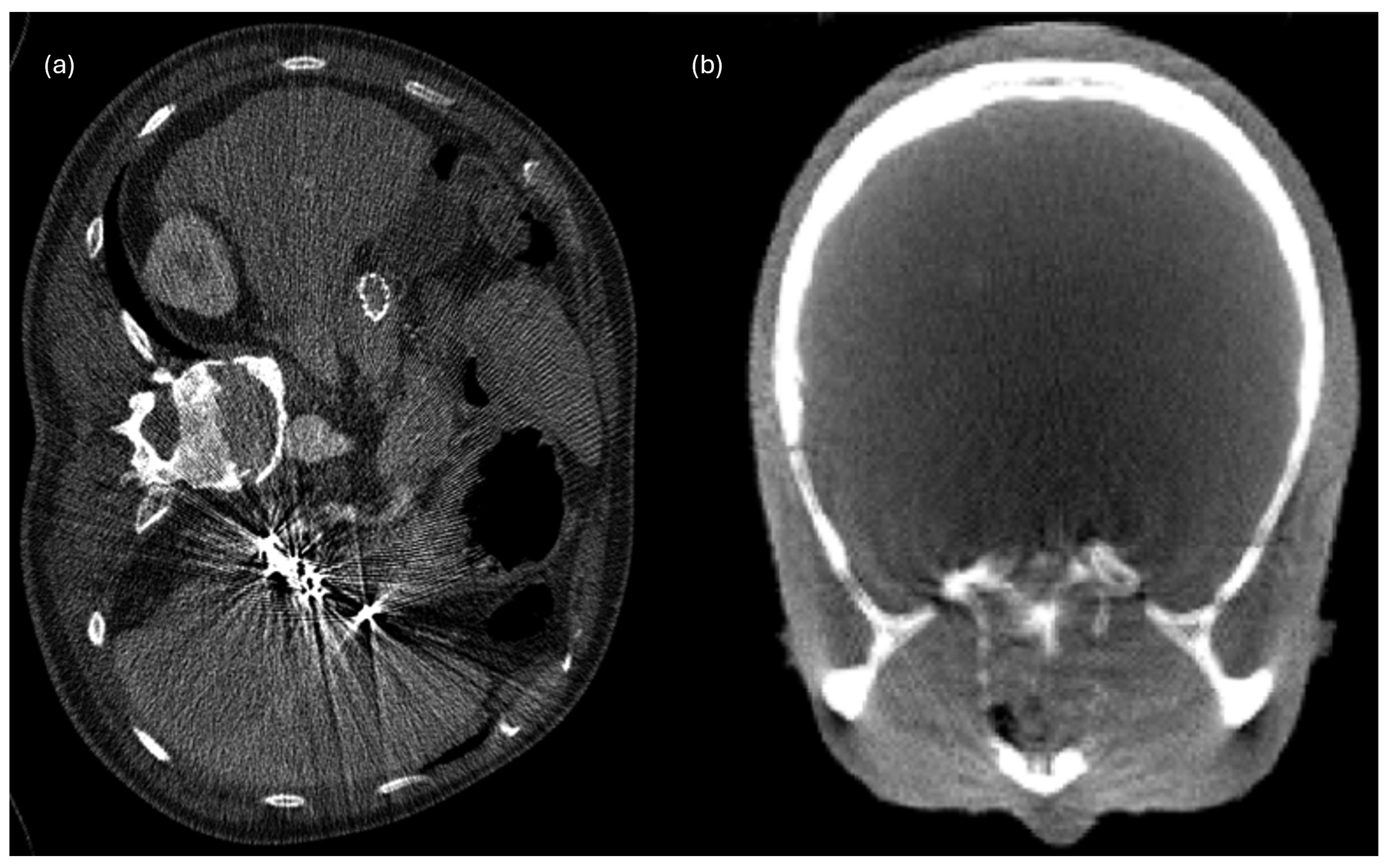 - Stowe, J. Suppression of the CT beam hardening streak artifact using predictive correction on detector data. Univers. J. Med. Sci. 2016, 4, 69–80. [Google Scholar] [CrossRef]