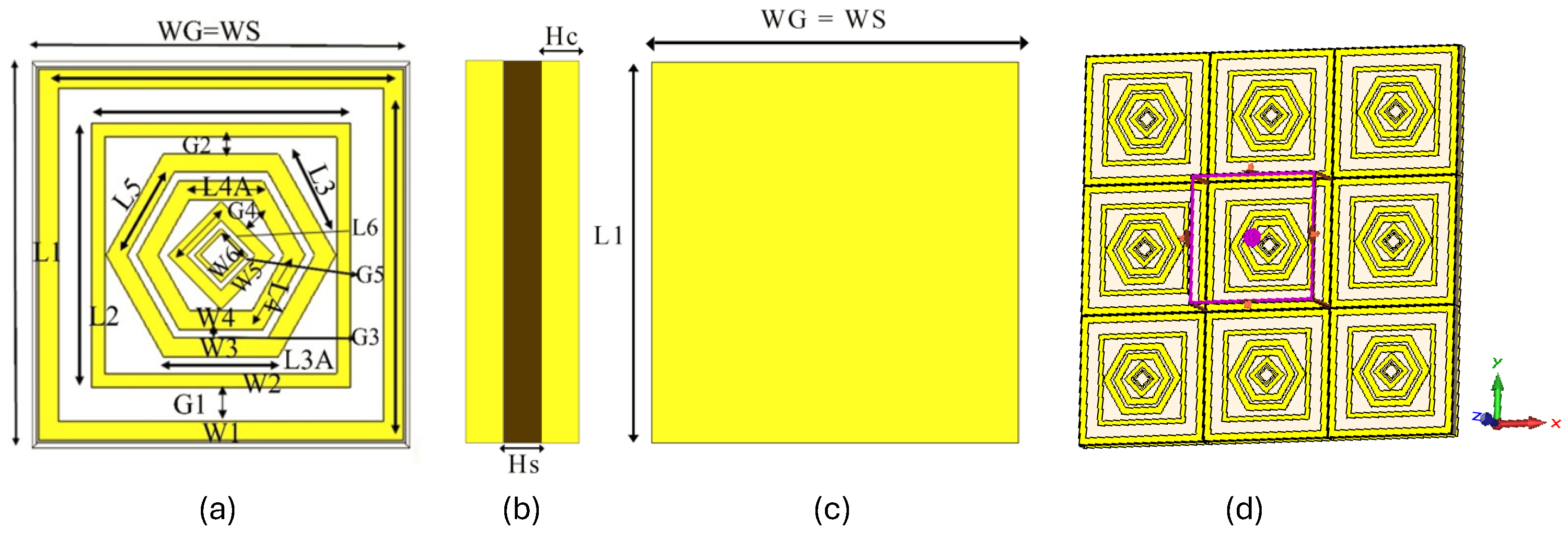 Figure 2. The top metallic layer consists of six resonant elements: two square rings, two hexagonal rings, and two diamond-shaped rings. Each resonator is responsible for a distinct absorption band. Specifically, the outer square ring produces a resonance at 2.178 GHz, while the inner square ring generates resonances at 5.484 and 11.811. The two hexagonal rings correspond to resonances at 8.391 GHz and 15.858 GHz, whereas the diamond-shaped rings generate a high-frequency resonance at 18.689 GHz, as shown in
