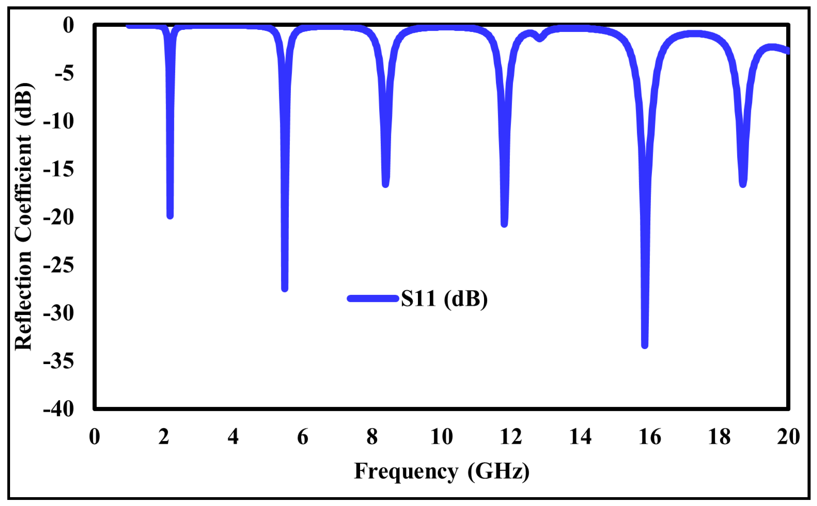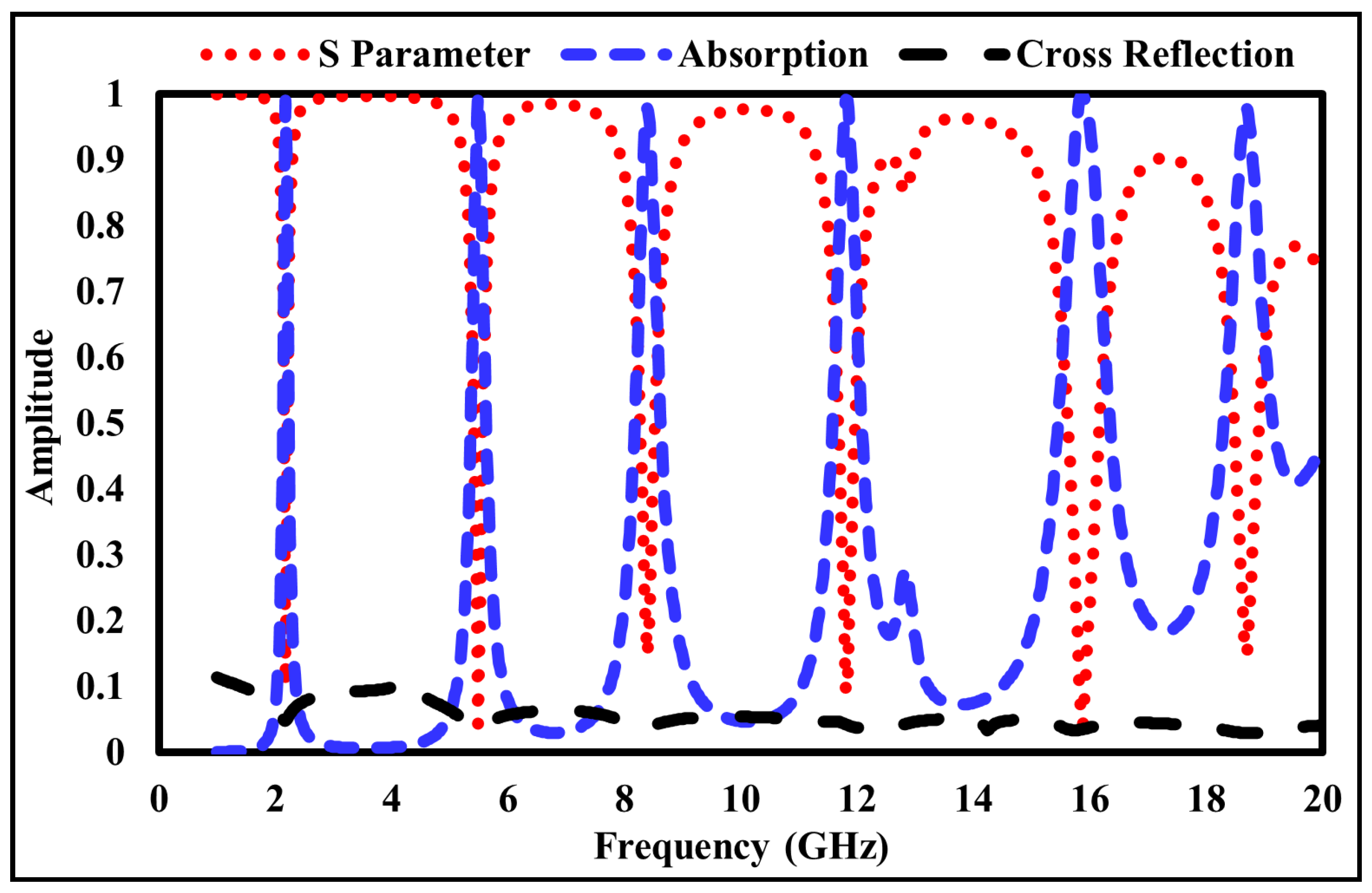 Figure 8. The combined plot demonstrates that the designed structure exhibits six distinct absorption peaks and corresponding reflection minima at frequencies of 2.178, 5.484, 8.391, 11.811, 15.858, and 18.689 GHz. The respective absorption magnitudes are 99%, 98%, 99%, 99%, 99%, and 97%, while the corresponding reflection coefficients are −19.88, −27.45, −16.59, −20.73, −33.40, and −16.63 dB.