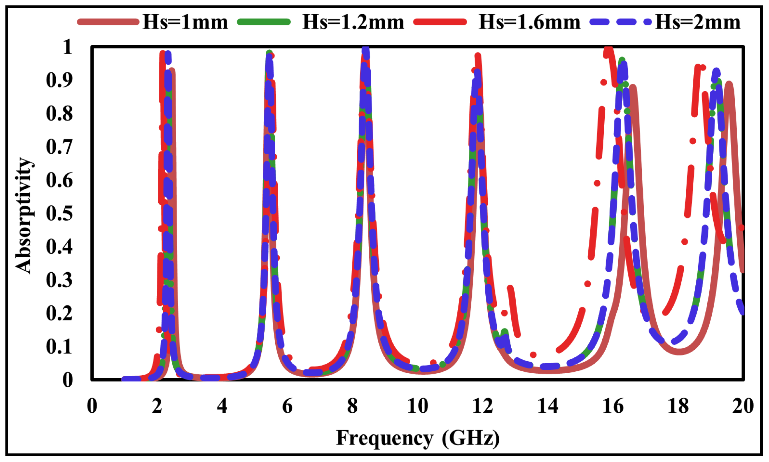 FR-4 is used as the dielectric substrate in the proposed structure. To investigate the effect of substrate thickness on the absorption performance, several FR-4 thicknesses 1.0 mm, 1.2 mm, 1.6 mm, and 2.0 mm were analyzed. As shown in