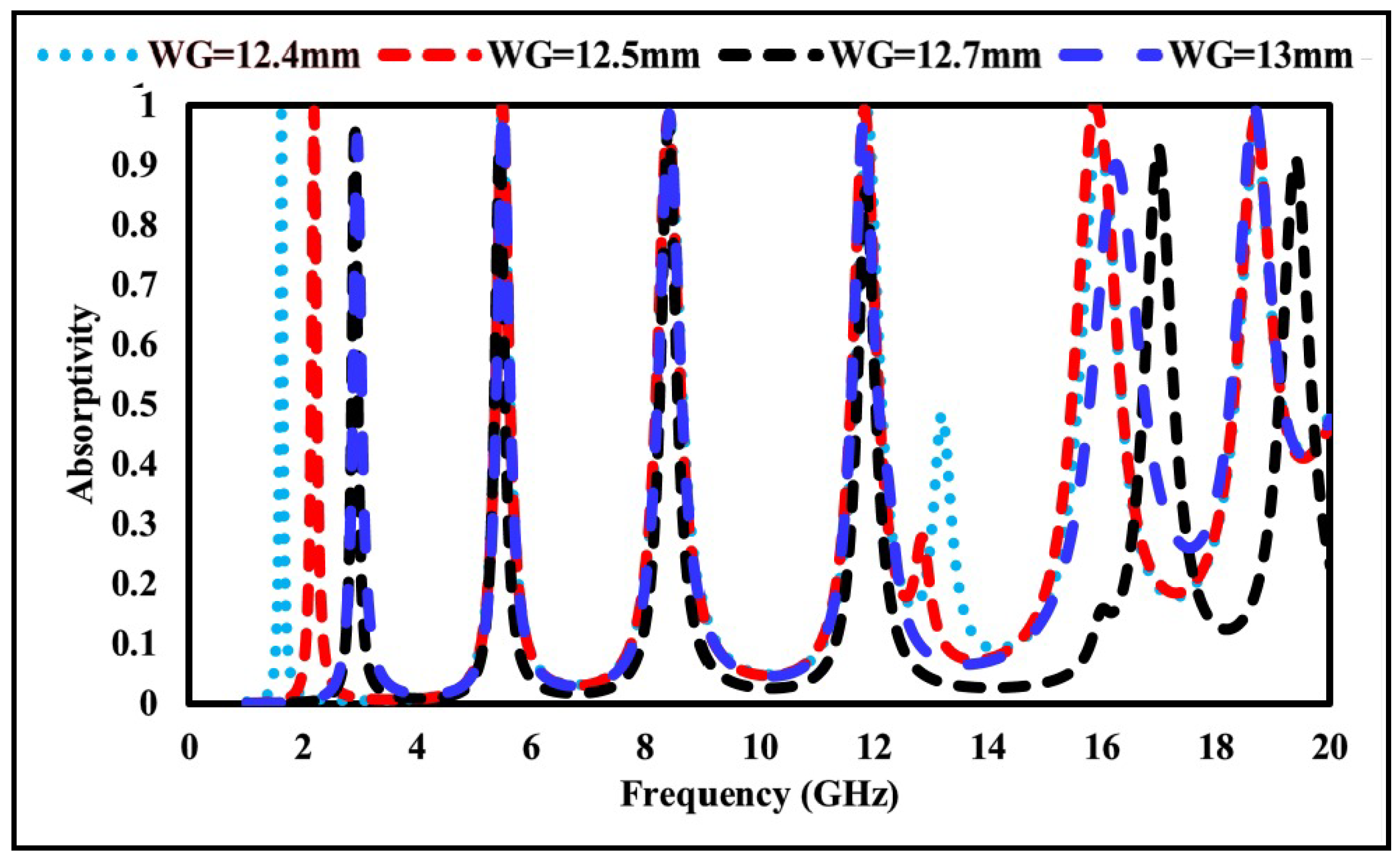 results in variations in absorptivity, particularly a reduction at higher frequencies. Parametric values of 12.5 mm, 12.7 mm, and 13.0 mm were analyzed, with maximum absorption obtained at