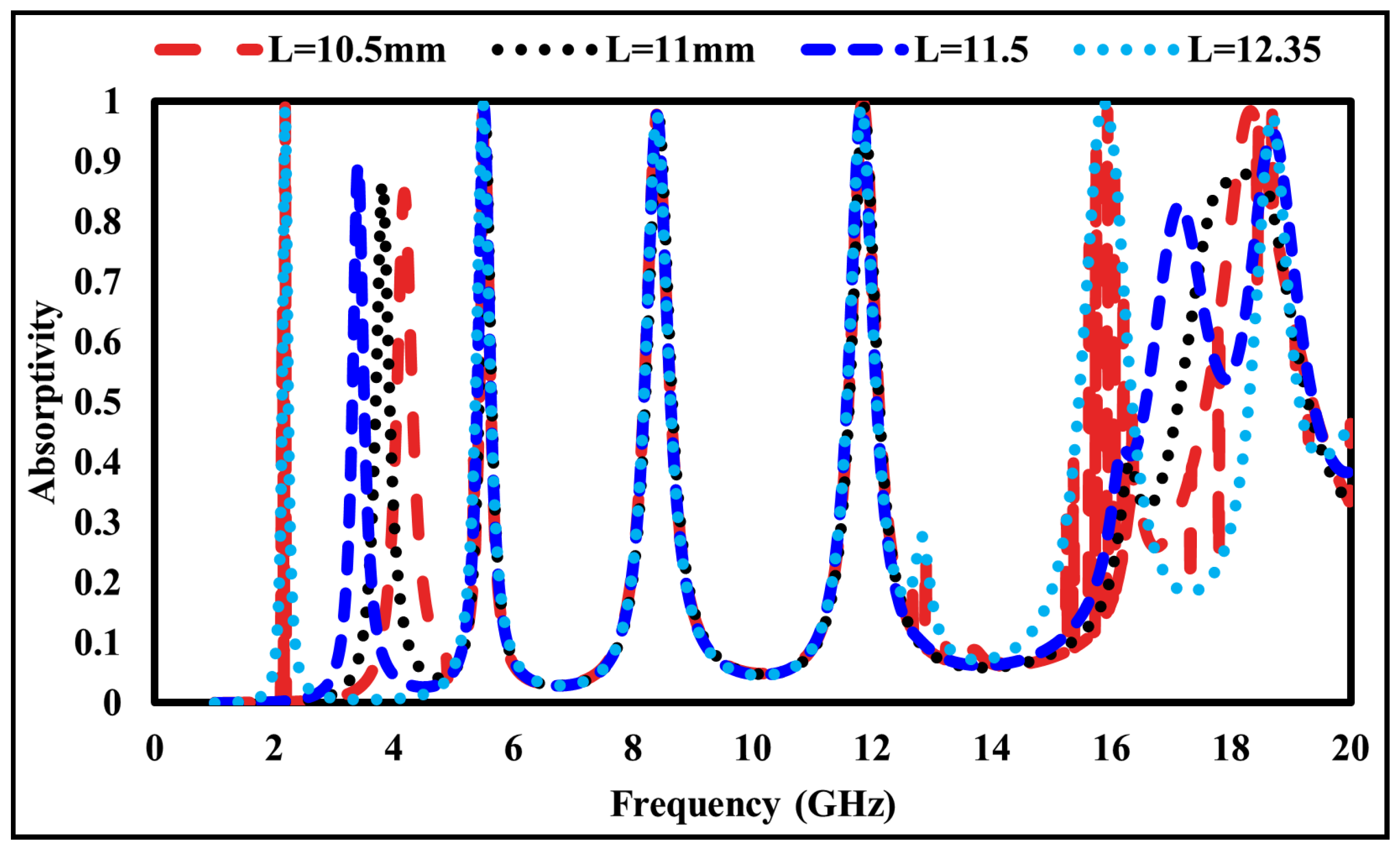 to 11.0 mm and 11.5 mm shifts the resonance to 3.793 GHz and 3.394 GHz, with absorptions of 85% and 89%, respectively. The maximum absorption of 98% is achieved at 2.178 GHz when