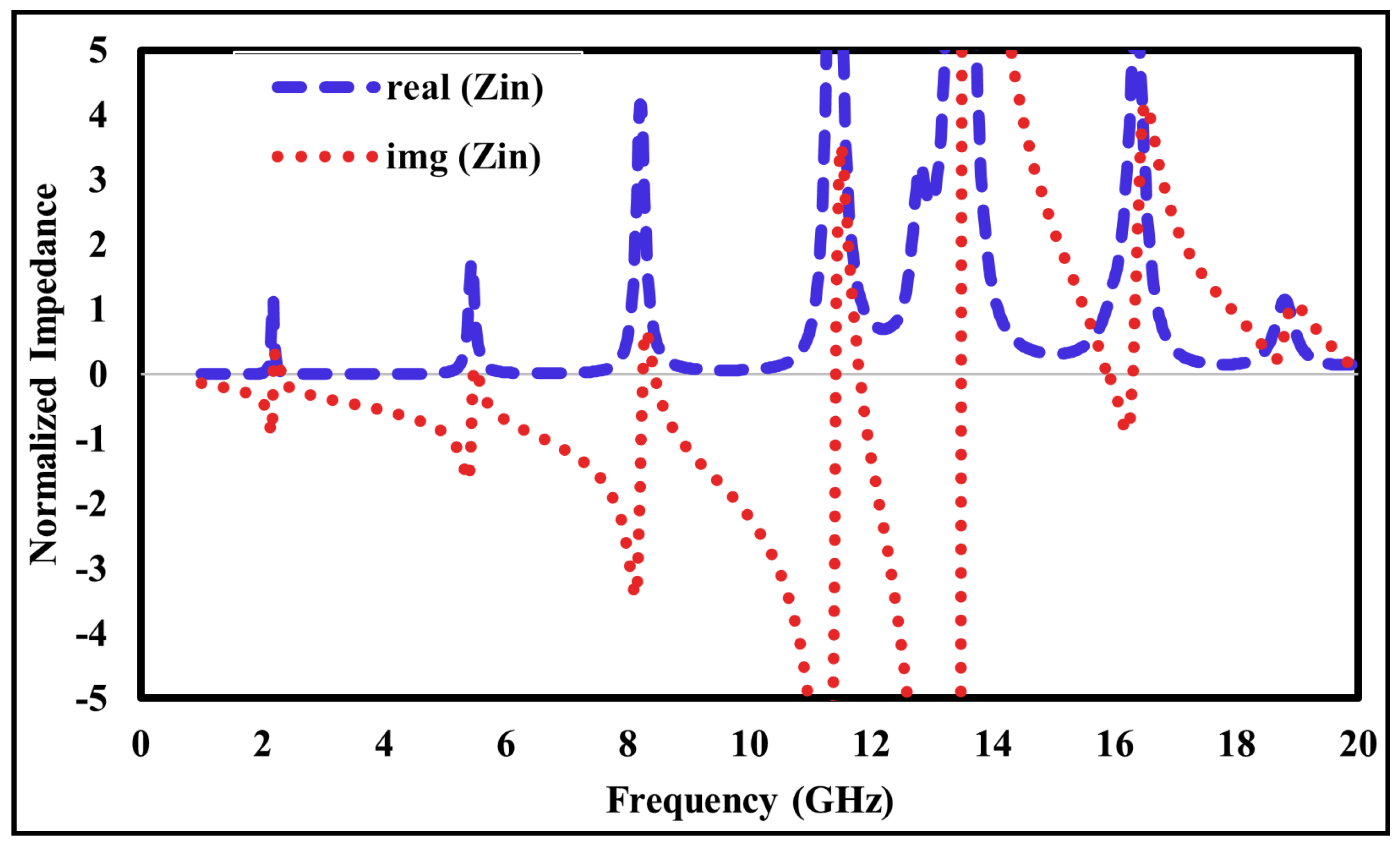 Figure 15. According to absorption theory, perfect absorption is entirely dependent on the input impedance of the structure. To achieve a high absorption ratio, the input impedance must be well matched to the free-space impedance. For verification, the input impedance characteristics were plotted over the entire frequency band. At resonance, the real component of the impedance is approximately unity, while the imaginary component is nearly zero.