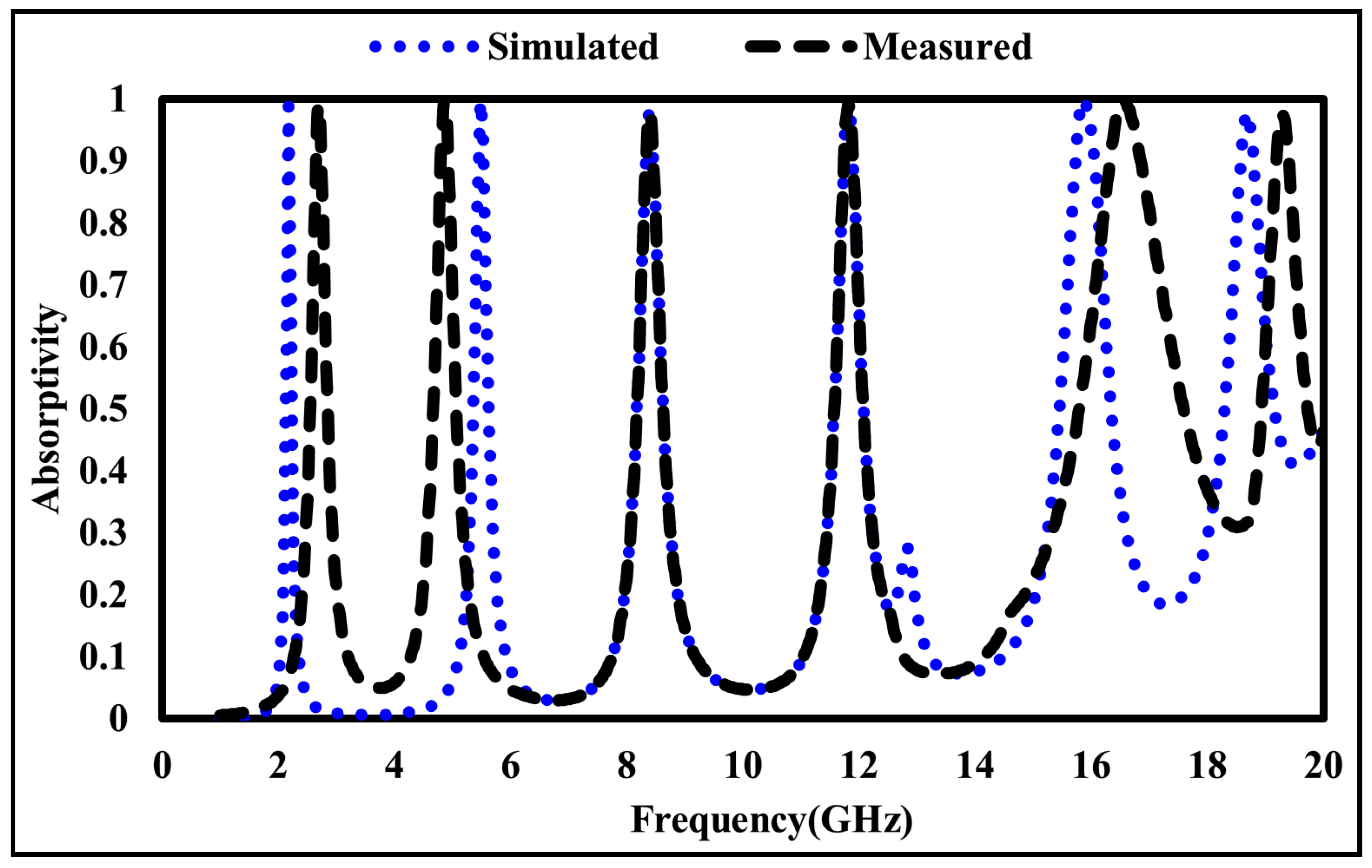 22]. Edries et al. (2020) reported a compact four-band MMA with absorptivity above 93% at 2.248, 2.878, 4.3, and 5.872 GHz, also exhibiting polarization-independent behavior [