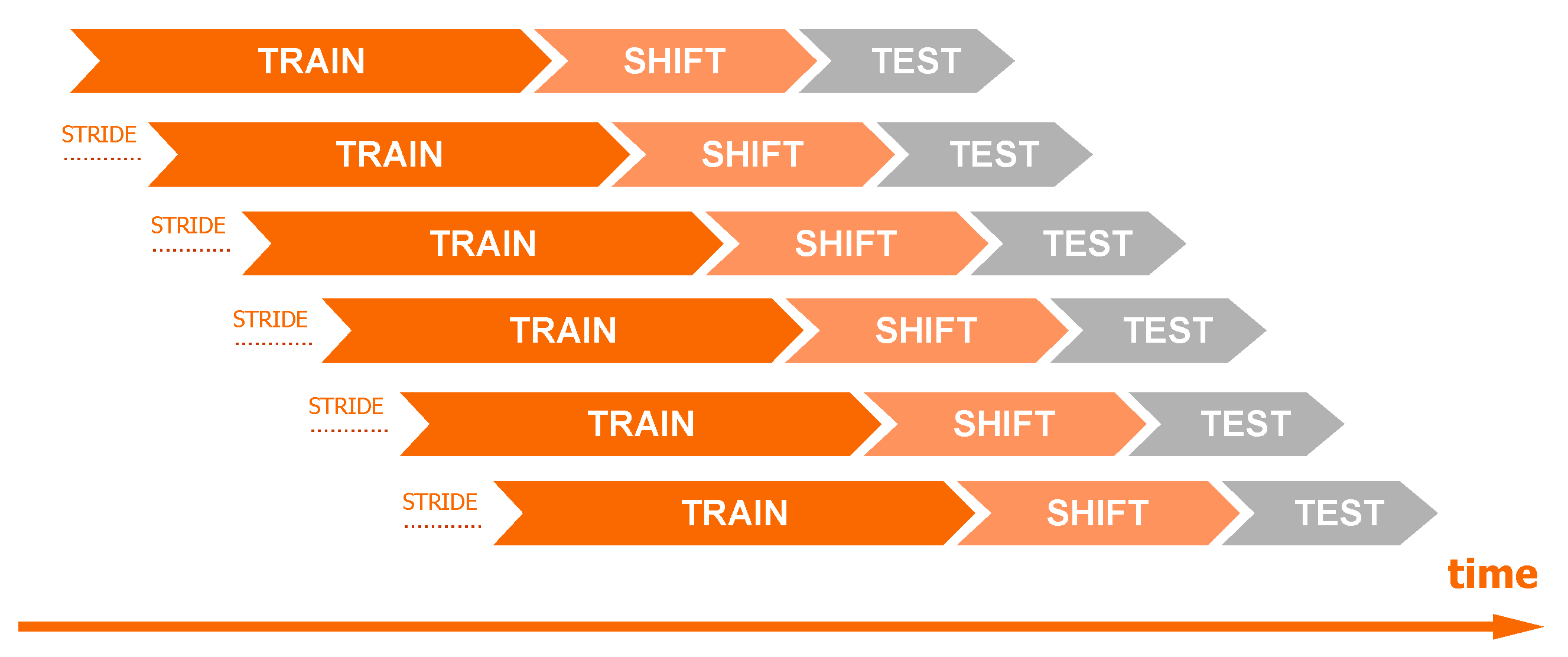 Figure 3. For testing purposes, we used a 1-day test period with a 1-day stride between each test. This means that for a 30-day analysis, we constructed 30 distinct models corresponding to each day. However, to reduce the number of calculations during hyperparameter optimization, the approach was slightly modified. The validation set for hyperparameter optimization was divided into weekly intervals (instead of daily). Consequently, our testing and stride period for this phase is extended to 1 week. Details can be found in
