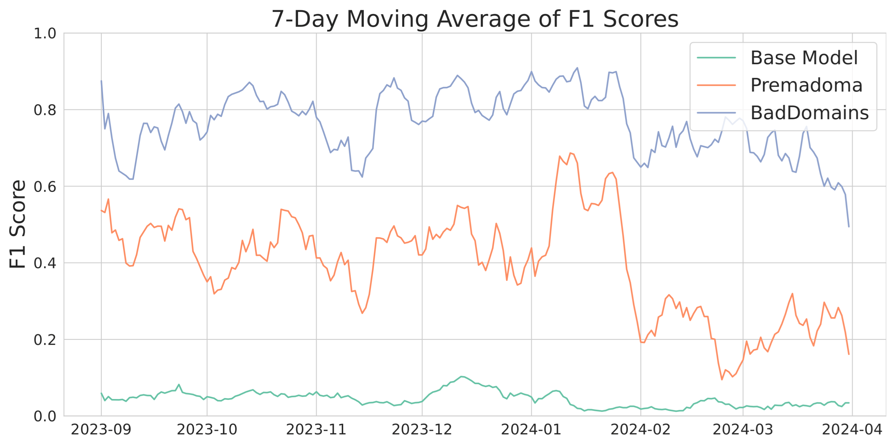 dropped from 0.79 to 0.17 (62 percentage points lower) for BadDomains and from 0.42 to 0.12 for Premadoma (30 pp lower); however, an increase from 0.04 to 0.05 is seen for Base Model.