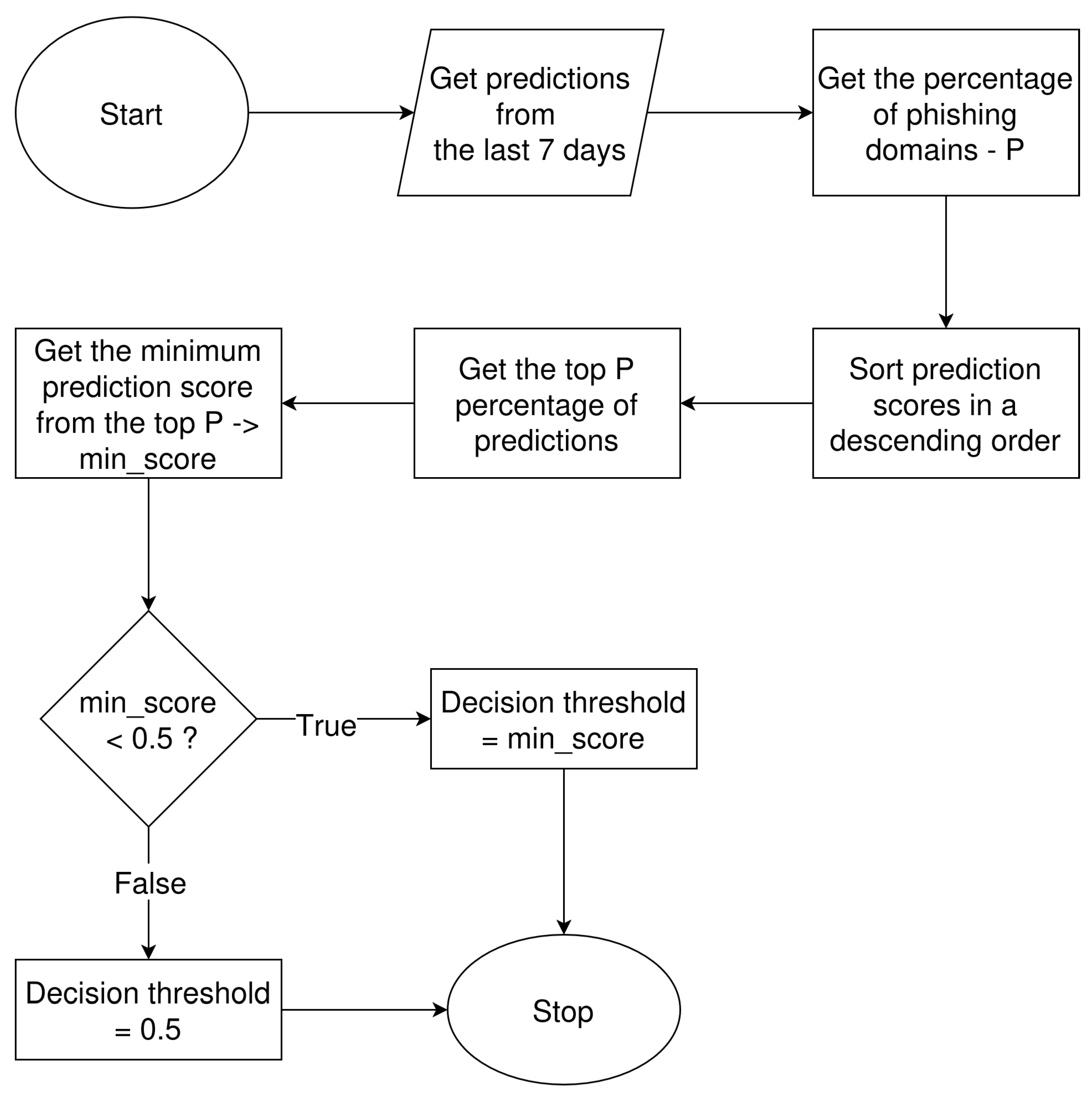 The mechanism first gets the model’s predictions from the last 7 days and calculates the percentage of phishing domains, denoted as P, among all those predictions. In the next step, prediction scores are sorted in descending order. Then, the top P percentage of predictions is obtained, and from this subset, the minimum prediction score is extracted. If this minimum prediction score is smaller than 0.5 (the default decision threshold value), then it becomes the new decision threshold value. Otherwise, the threshold remains unchanged.
