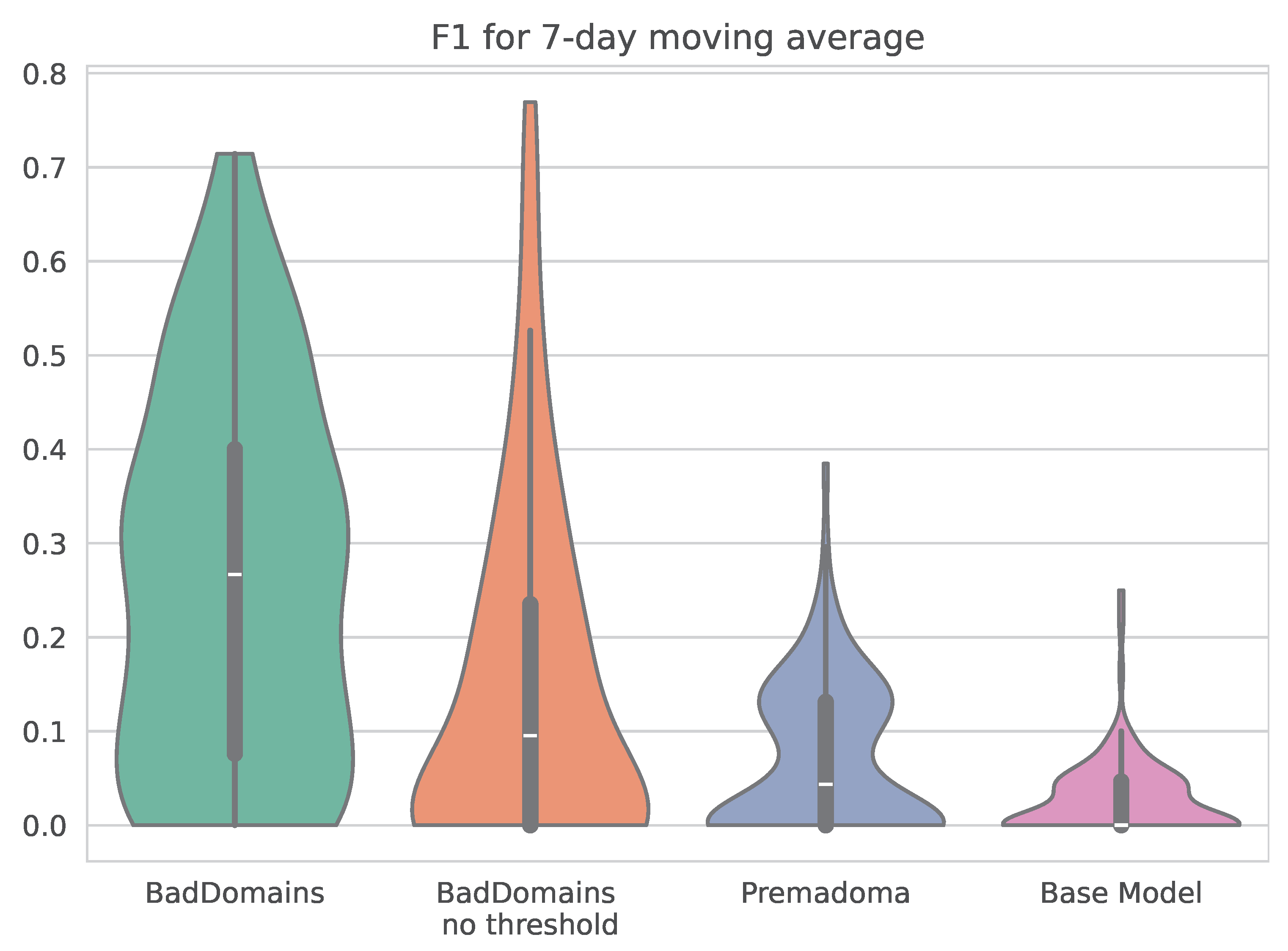 measure in the preliminary deployment period. The measure was calculated in 7-day increments. It shows that all methods have low detection levels. BadDomains and Premadoma have a similar median value of 0.1, still higher than the Base Model. However, BadDomains’ value distribution shows more data points at levels higher than 0.3, which is also seen in higher classification levels than Premadoma in